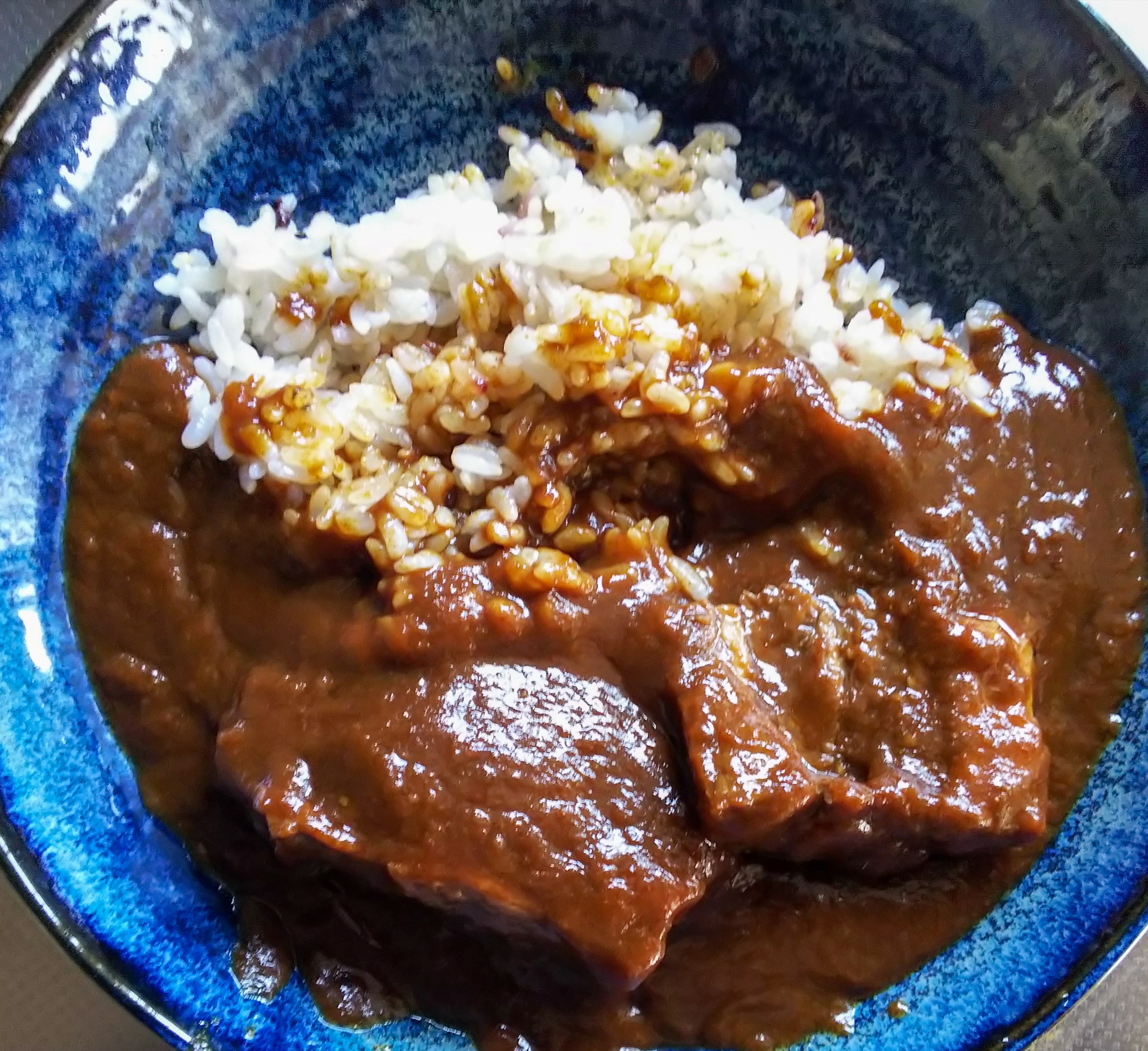 コロナ禍以前は、仕事で2か月に一回は仙台に行っていて、牛タンを食べるのが楽しみでした。仙台での牛タン定食を意識して、麦飯を用意し、カレーをかけてみました。盛り付けた時点でますます気分が上昇!