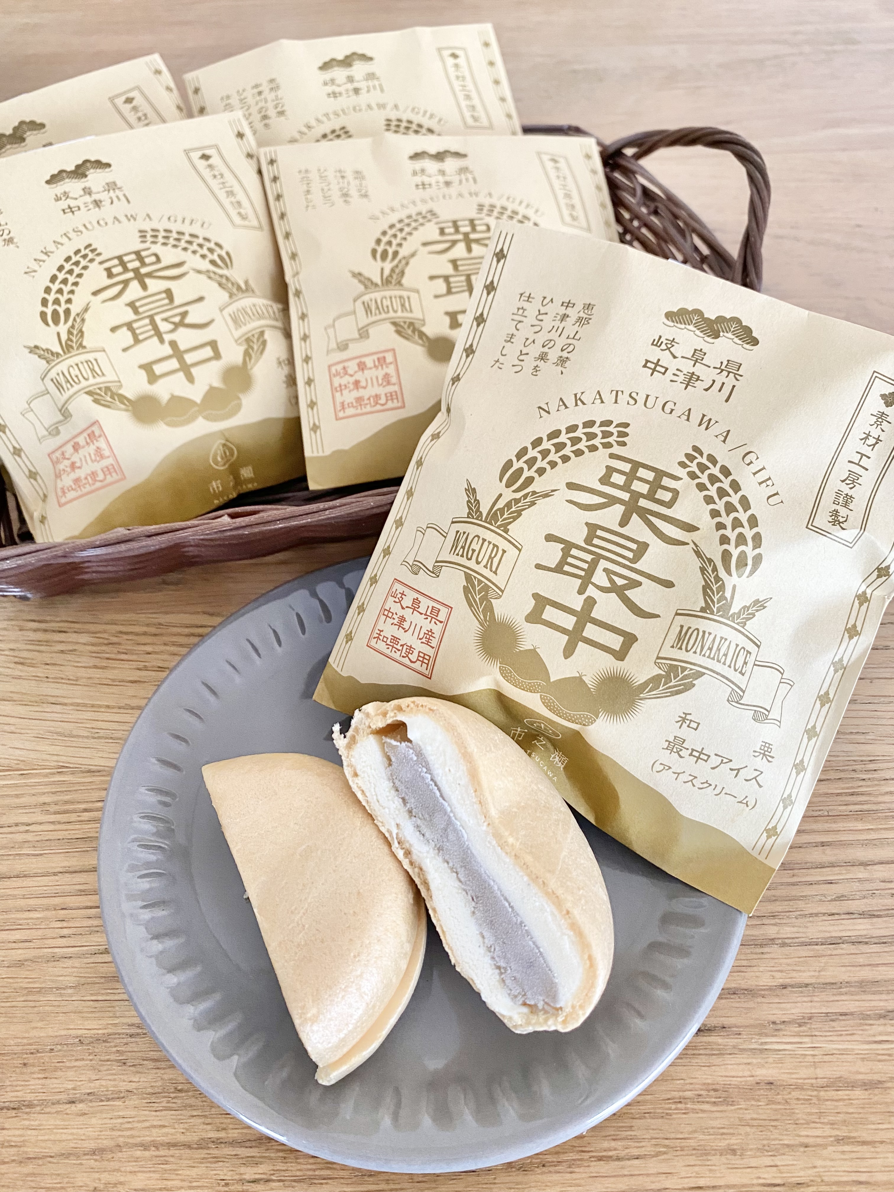 岐阜県中津川市で採れた良質な栗をふんだんに使用した「和栗最中アイス」です。アイス用に開発した最中とバニラアイスで栗餡を挟みこんでいます。栗の風味、食感を活かすために甘露煮、粗栗、栗粉を使用した栗餡に、味ムラが出ないよう、少量ずつ職人が調理しています。冷たいままだけでなく、オーブンで20~30秒位温めると、パリパリの最中にアイスが蕩け栗の風味が際立つ、温冷スイーツとしても楽しめます。