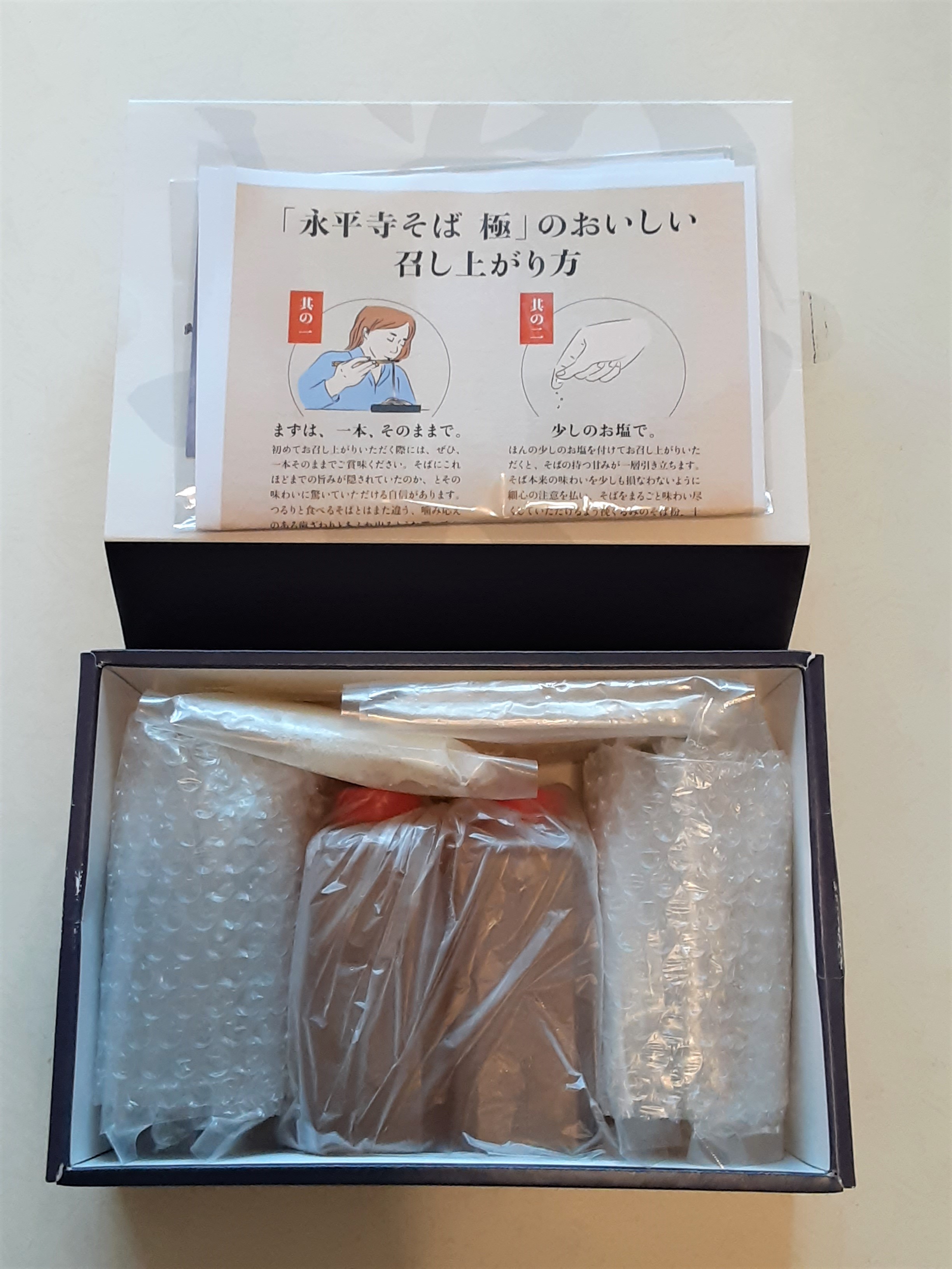 お蕎麦屋さんらしい箱を開けると生そば120gx4、つゆ320mlx2とすり下ろされた辛み大根2袋パンフレットとおいしい召し上がり方、そばのゆで方、原材料製造者の書かれた紙が入っていて消費期限は到着日を入れて12日です。