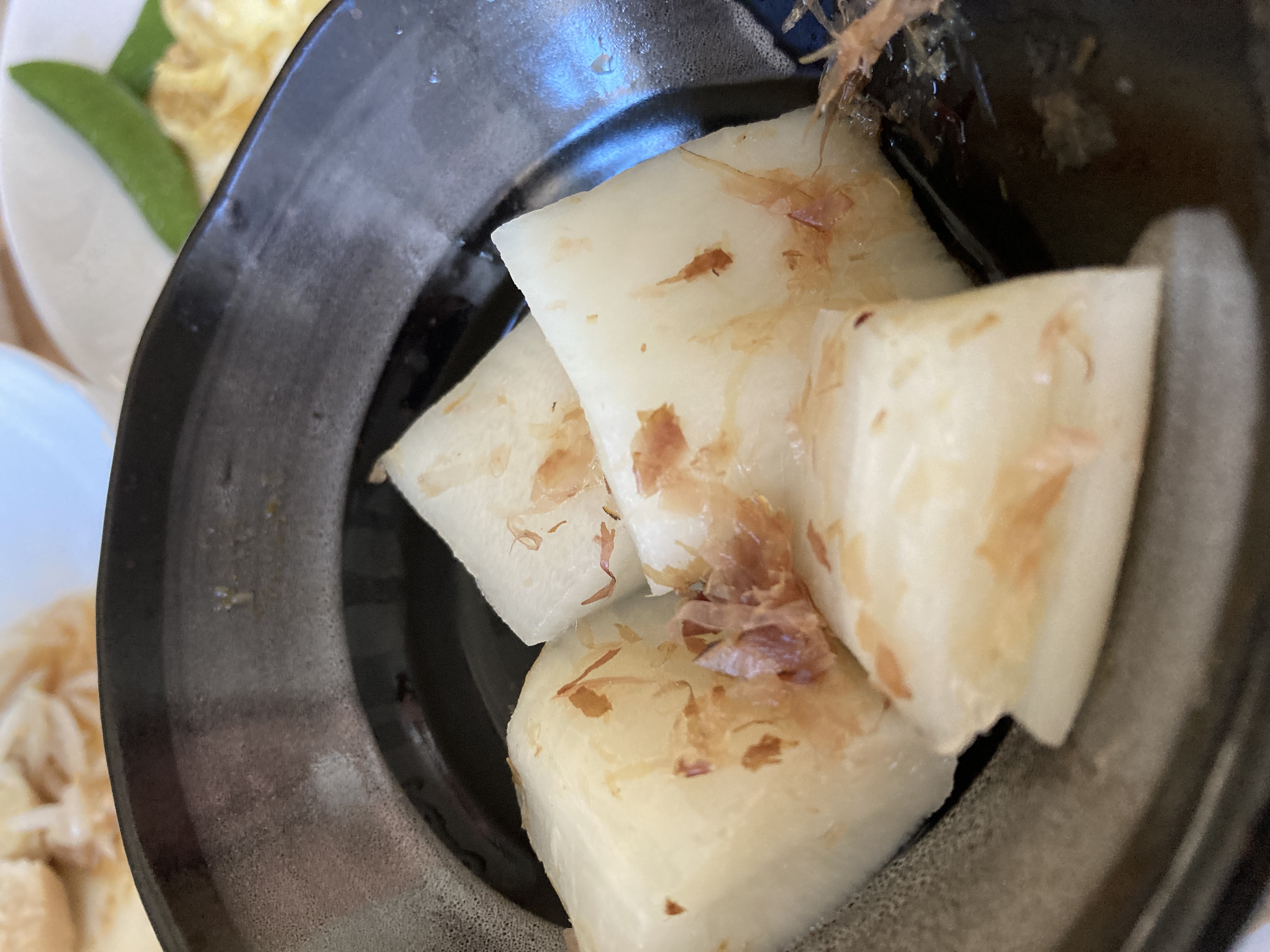 かつお大根は、大きめにカットされているのに大根の中まで味がしみていて、食感もしっかりでした。カツオがもう少し多くても良いかもと思いましたが、物足りない感じがしたわけではありません。