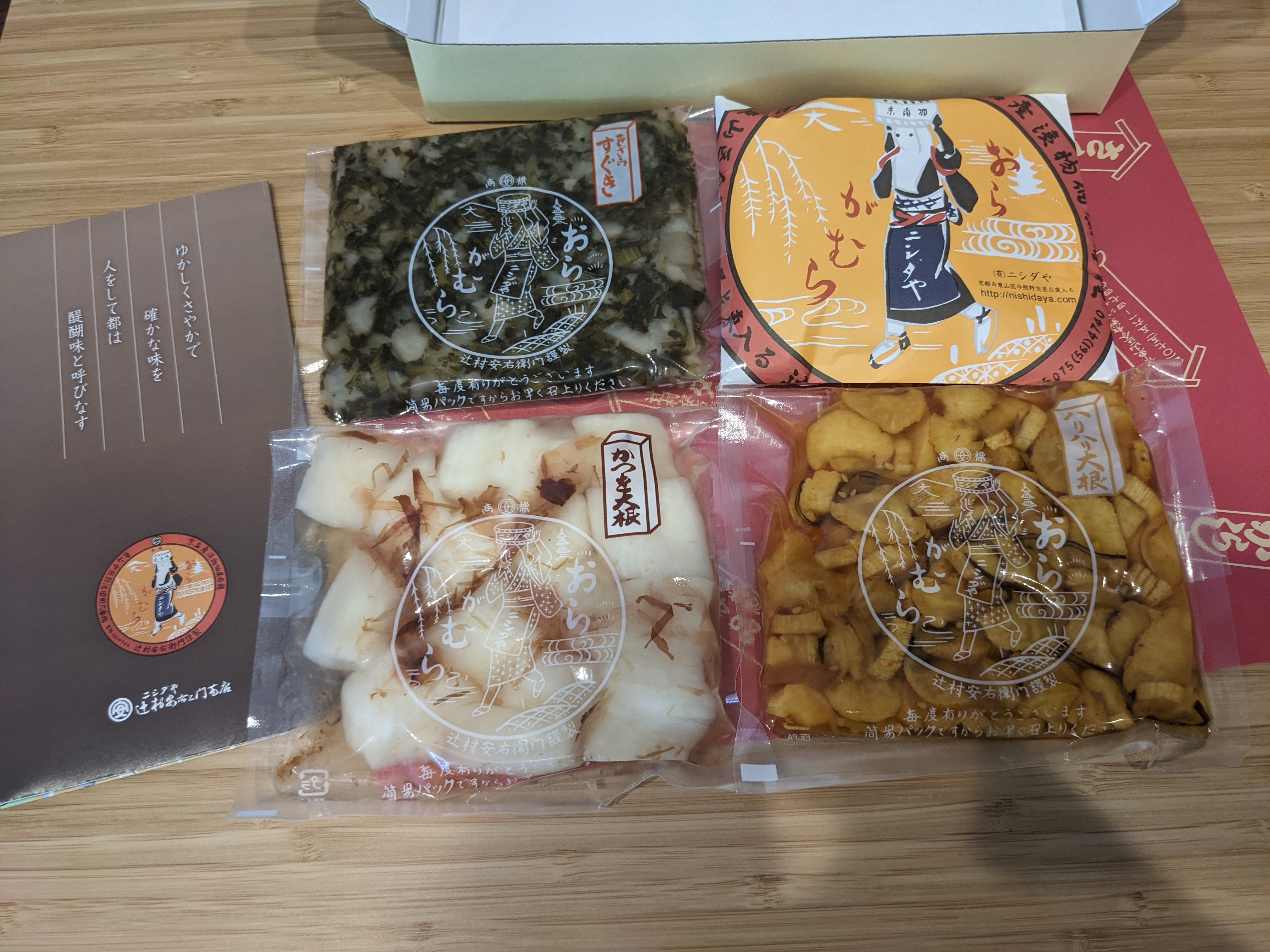 中身は種類別に個包装になっていて、おらがむら、かつお大根、ハリハリ大根漬、刻みすぐきの四種です。