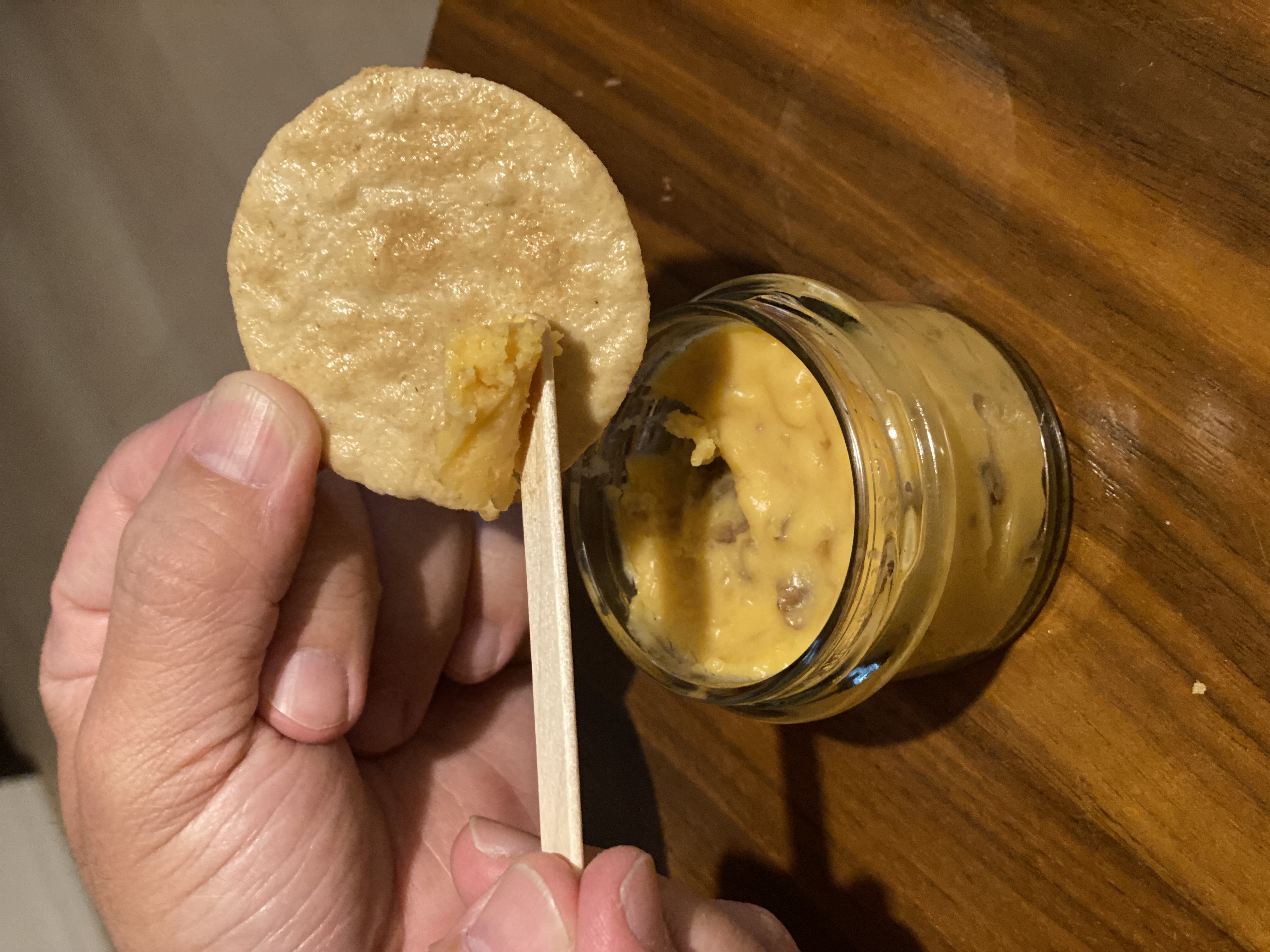 チェダーチーズといぶりがっこのディップは、濃厚なチーズなのに、それを感じさせないいぶりがっこの燻製の味と鼻に抜ける薫りがたまらない美味しさです。