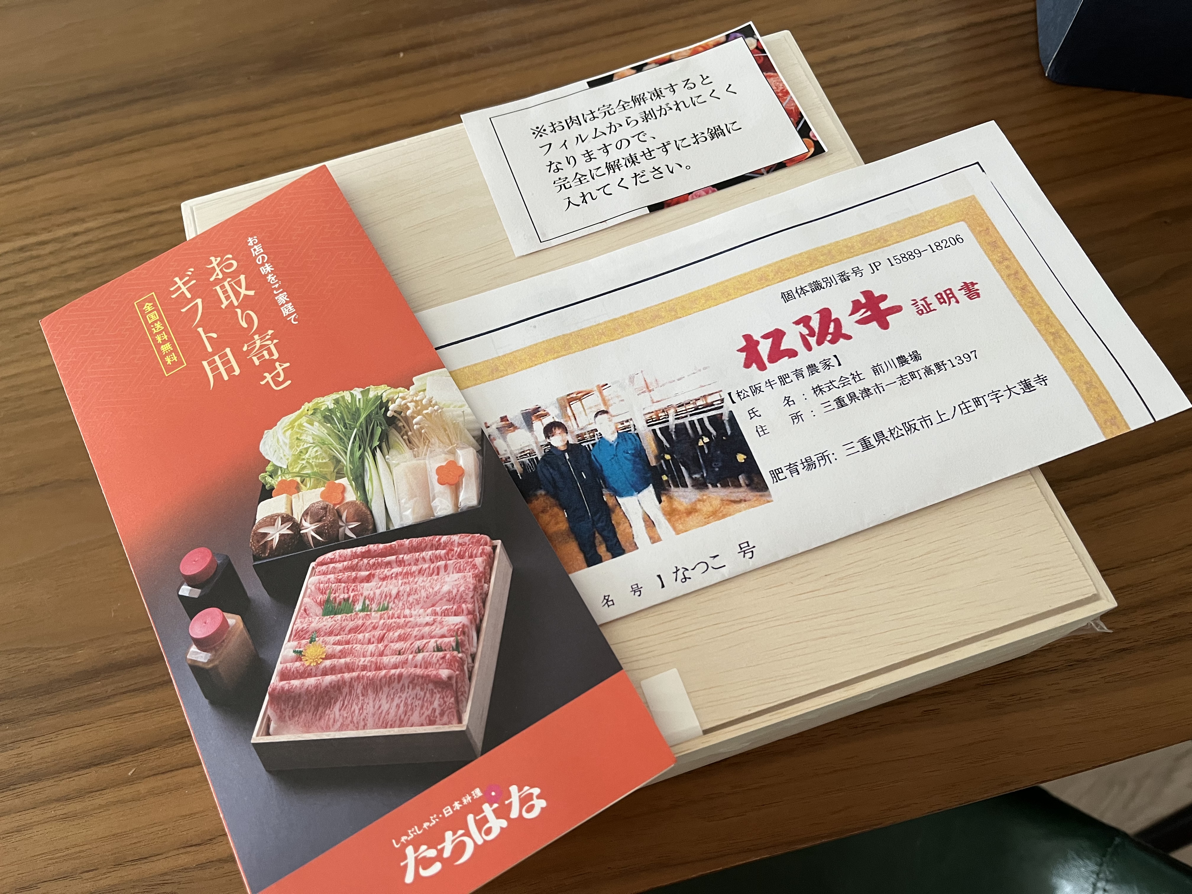 お肉は冷凍で届きます。賞味期限は約半年後でした。お肉と一緒に、商品説明と松坂牛証明書が同封されています。松坂牛証明書には名前や品質規格、肥育日数などが記載されており、しっかりとした品質管理をされているということがわかります。併せて、『命を頂いている』ということを実感させられ、美味しく有難く頂こうという気持ちになりました。