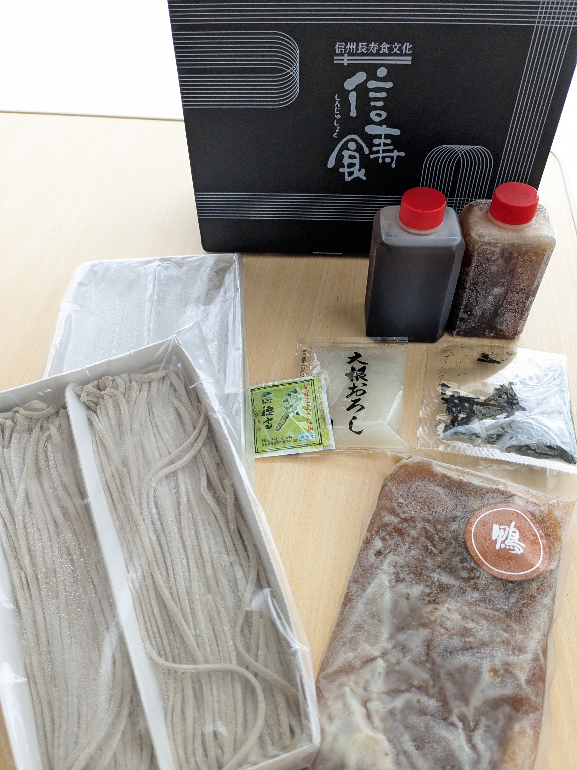 そばの味と香りがしっかりと感じられる信州の「田舎そば 鴨つけ汁」セットです。国産そば粉八割、つなぎ二割の「黄金比率」二八そばで、粗挽き独自の香り高さと強いコシが特長。こね、延ばし、切りを職人が短時間で仕上ています。相性抜群の付け汁には鴨と葱が入っています。鴨の旨味と、葱の香り、だしの効いた汁が三位一体となってそばを引き立てます。できたてをすぐに袋詰め、冷凍することにより鮮度を実現しています。保存料や化学調味料は一切使用しないので安全です。わさびや大根おろしなどの薬味もセットになっているので別途用意しなくてよいので便利です。化粧箱入りなので、贈り物にもおすすめです。