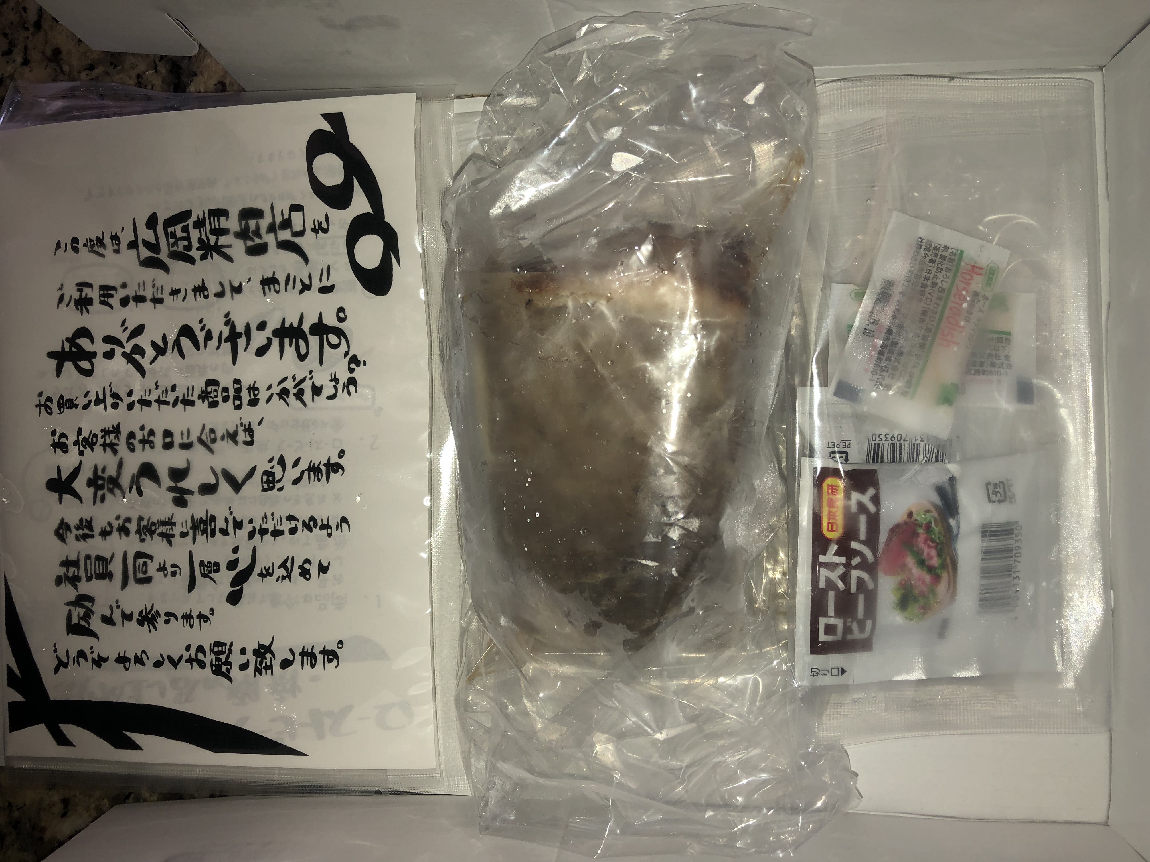箱の中には、冷凍されたローストビーフ、ソース2袋とホースラディッシュ3袋(1袋多く入っていました。)。