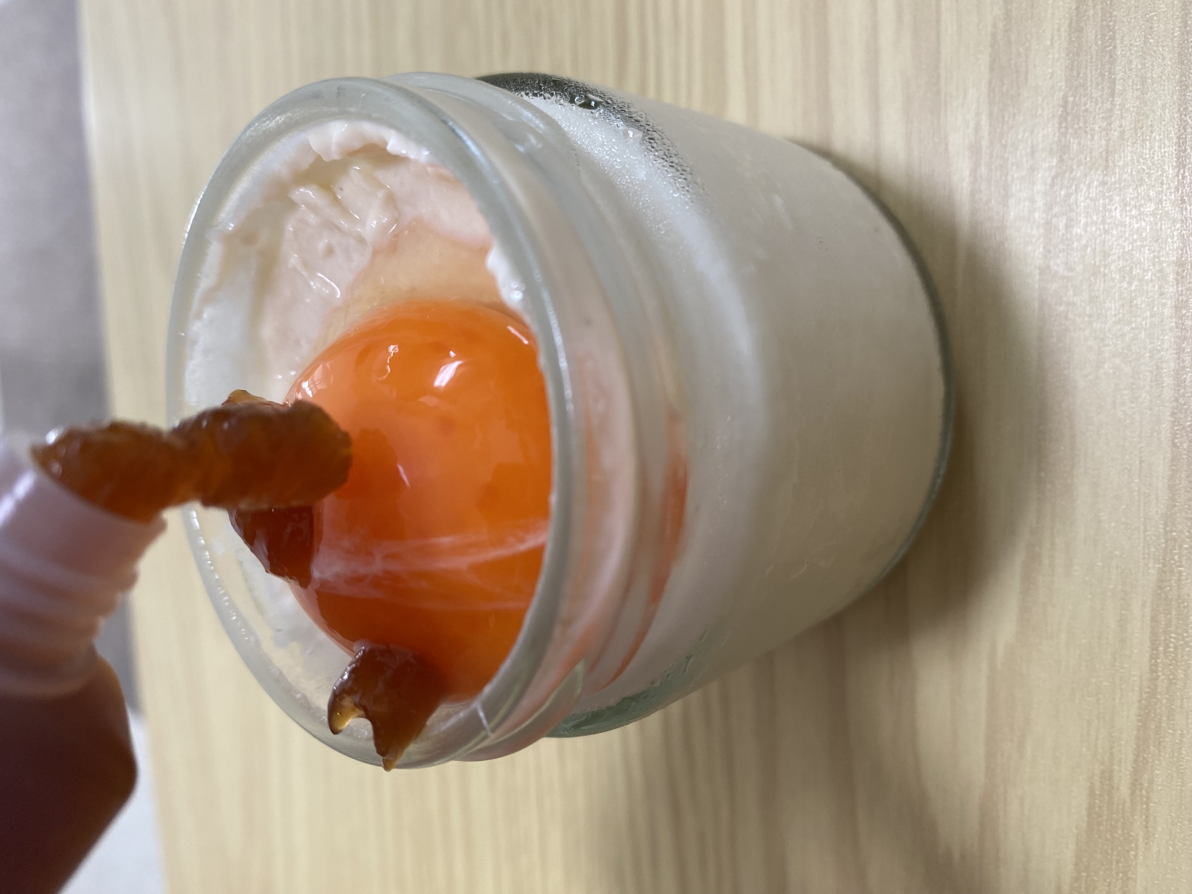 食べる直前に青色の新鮮な卵の黄身を乗せ、ソースをかけて食べるのです。