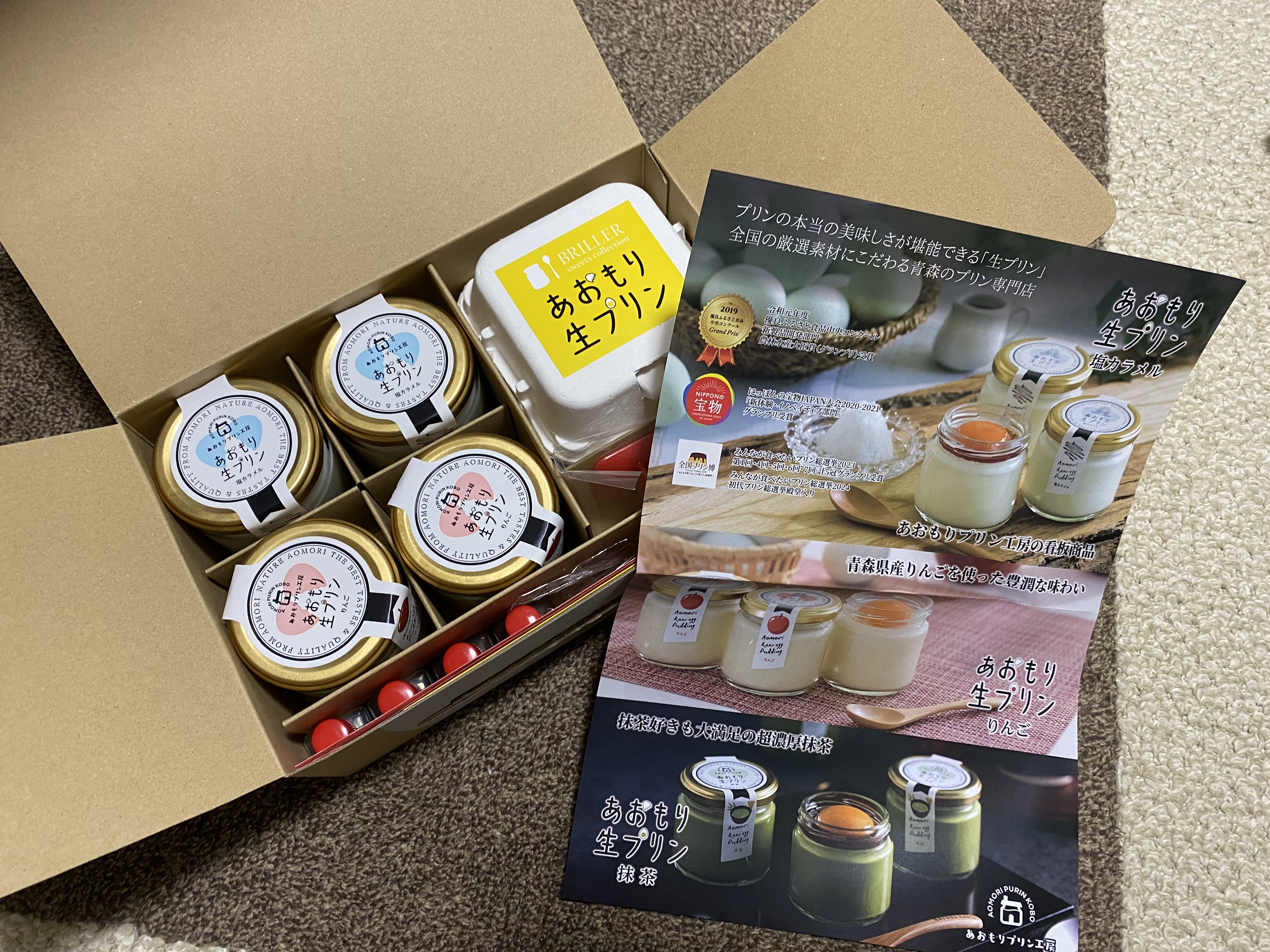 可愛い映えている、箱にプリン2種類(りんごのプリンと塩カラメルプリン)と、なんと青い本物の卵4と、別でりんごソースと塩カラメルがついており、盛りだくさんで目まで楽しめるプリンセットで、テンション上がって写真をたくさん撮ってしまいました。