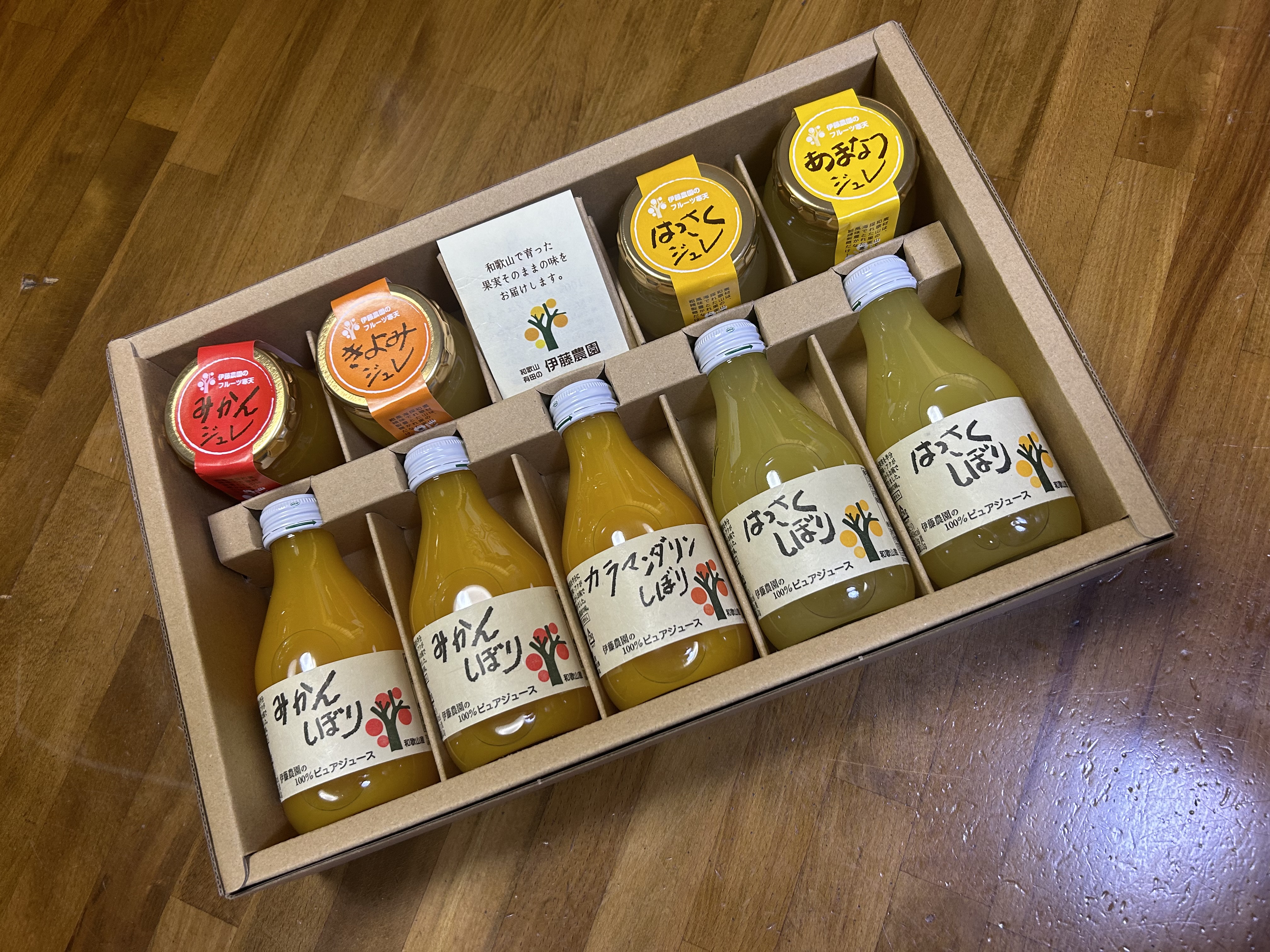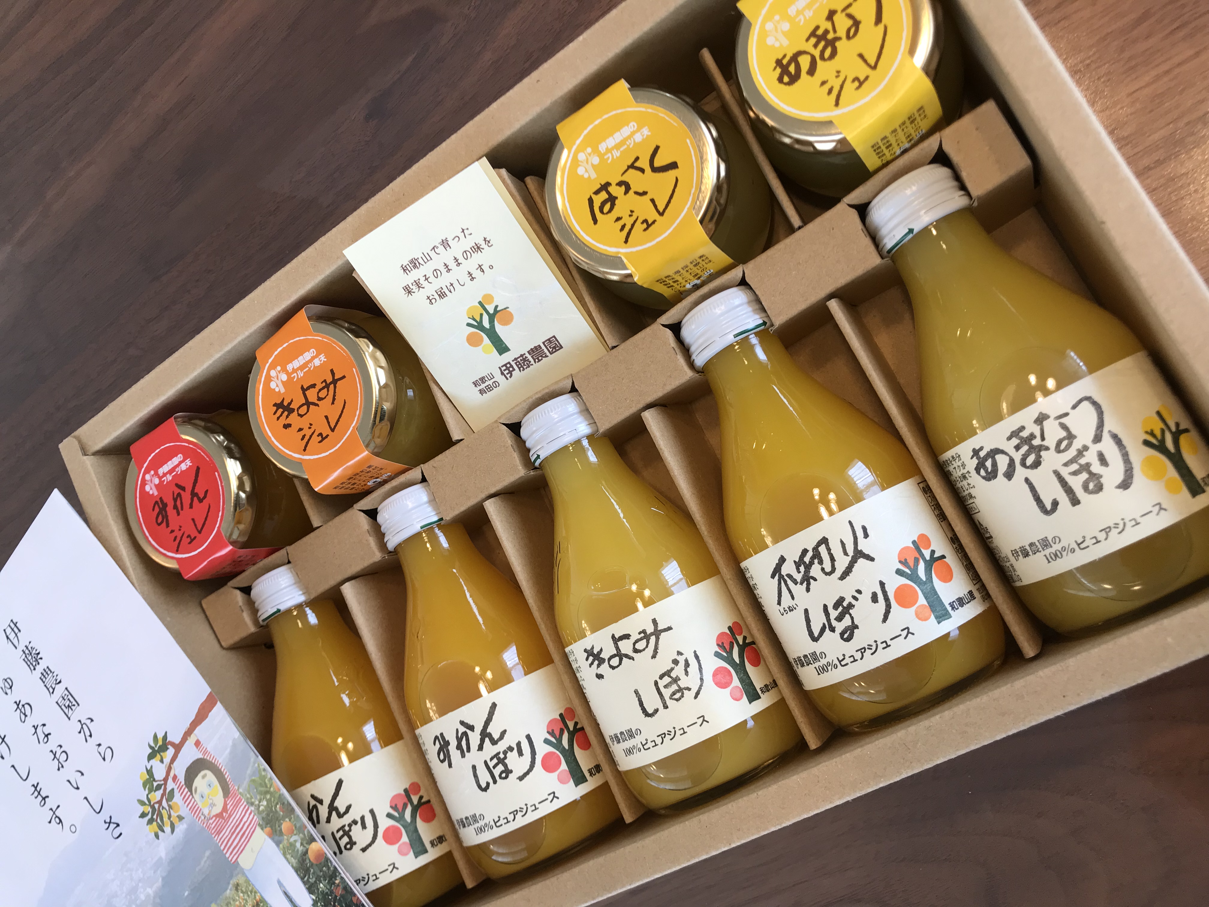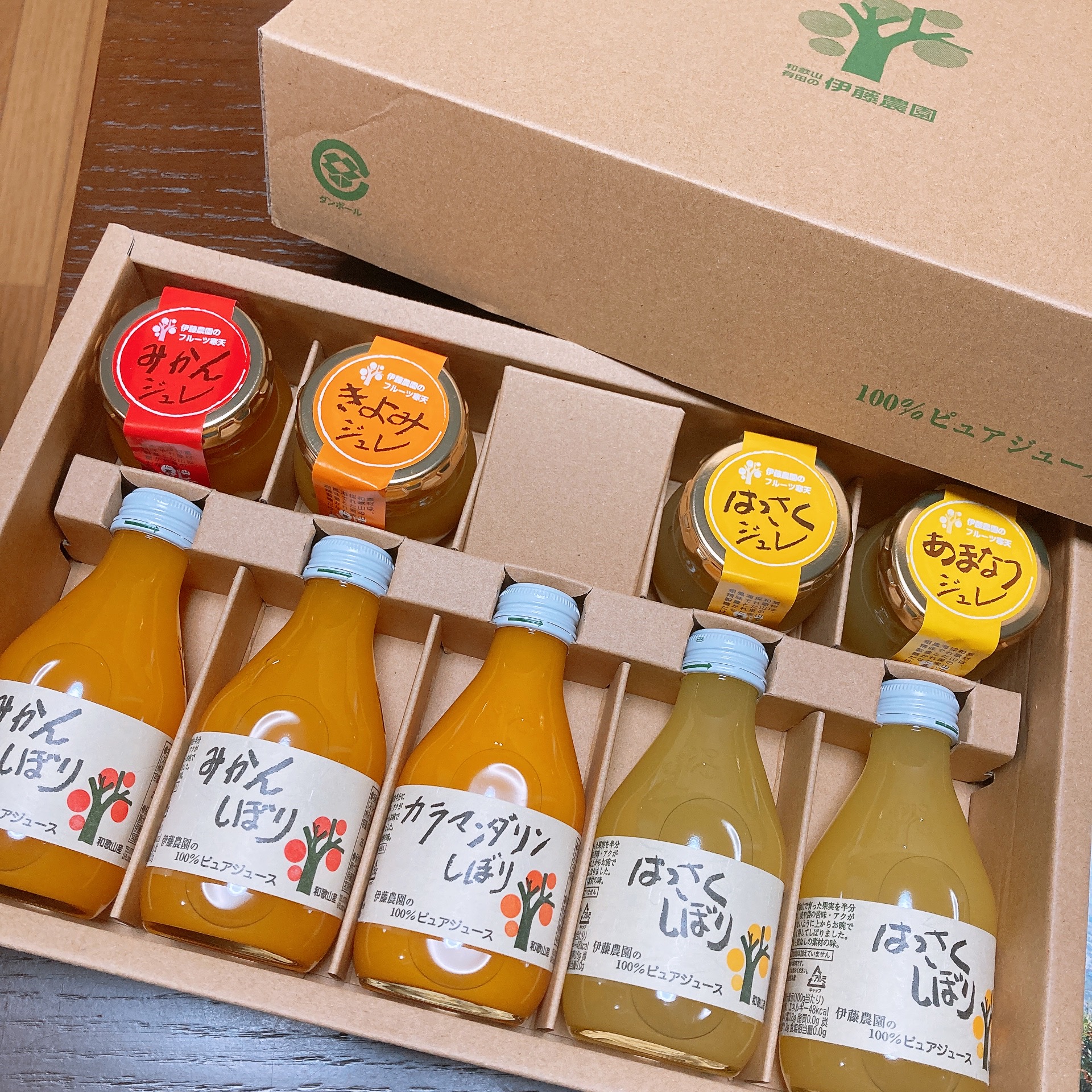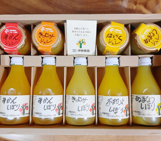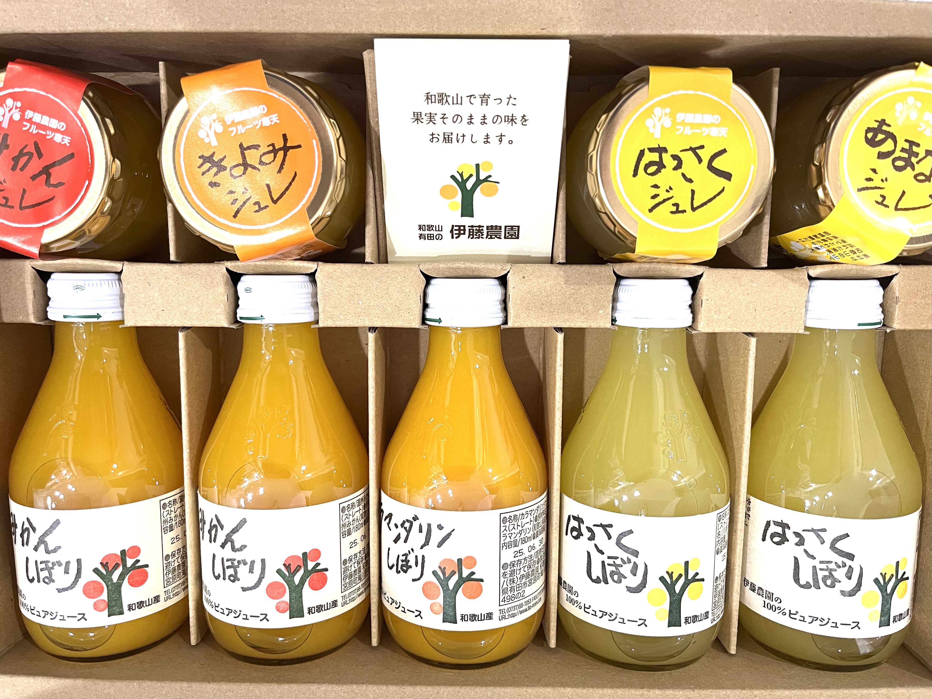 和歌山の農園で育った柑橘類の「100%ピュアジュース&ピュアフルーツ寒天ジュレ」セットです。みかん本来の味を楽しめる「100%ピュアジュース」は、100%ストレート果汁です。果皮の油脂や雑味を混ぜることなく、美味しいところだけを搾っています。みかんやはっさくなど3種セットなので飲み比べも楽しめます。ぷるっぷるっの食感がたまらない「ピュアフルーツ寒天ジュレ」は、すっきりとした後味と、つるっとした食感が特長。こちらもみかんやはっさくなど4種の柑橘類がセットになっているので異なる味わいが楽しめる商品。化粧箱入りなので、お中元などのギフトにもおすすめです。