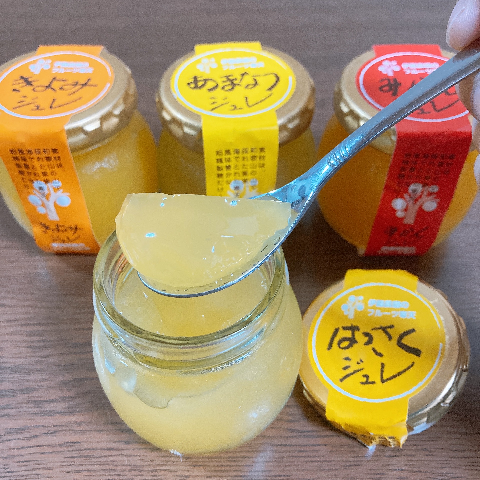 ジュレはどれも、原材料が商品名の柑橘と粗糖と寒天のみ!子供たちと一緒に安心して楽しめるのがありがたいです。また、寒天ゼリーなのでプルっプルの食感もいいです!