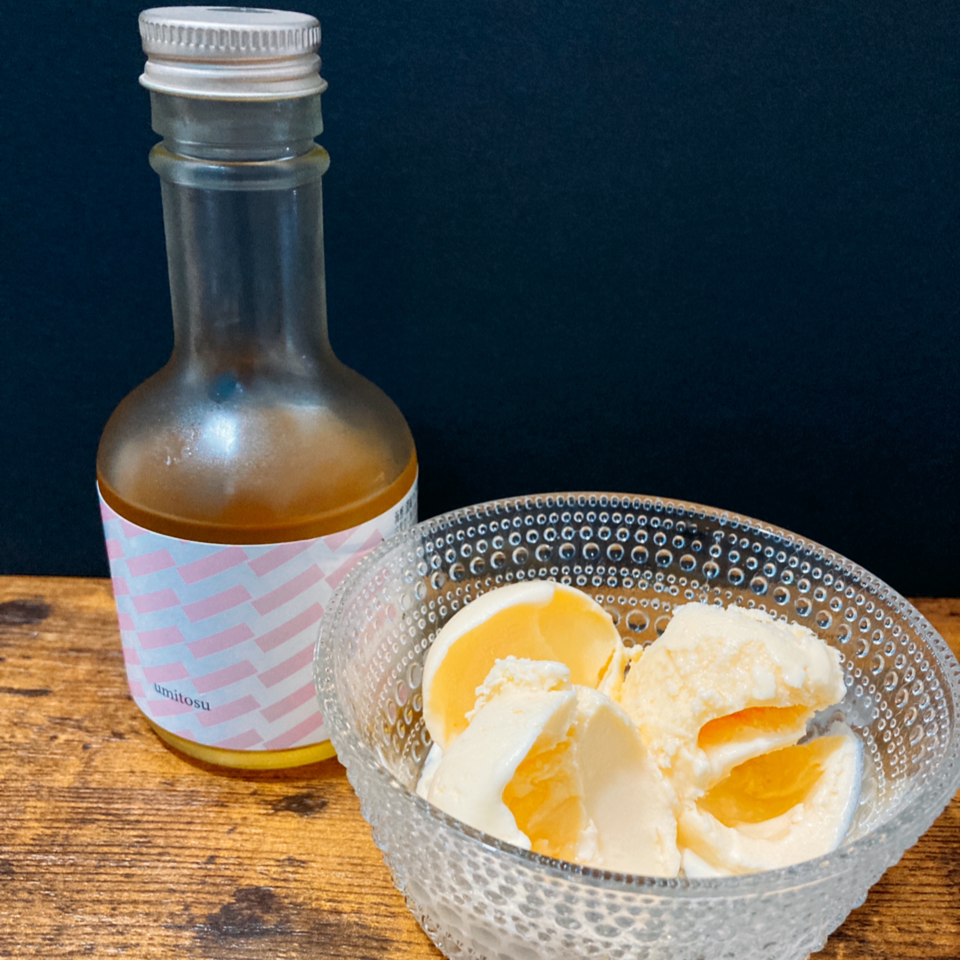 バニラアイスにumitosuを薄めずそのままかけて食べると、絶妙な甘酸っぱさがやみつきに!!是非一度お試しください。