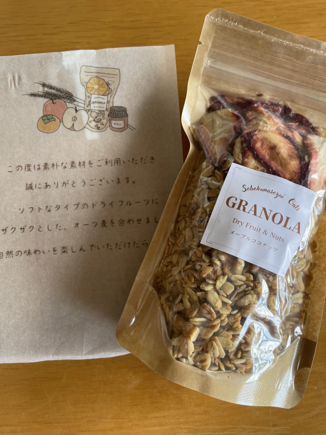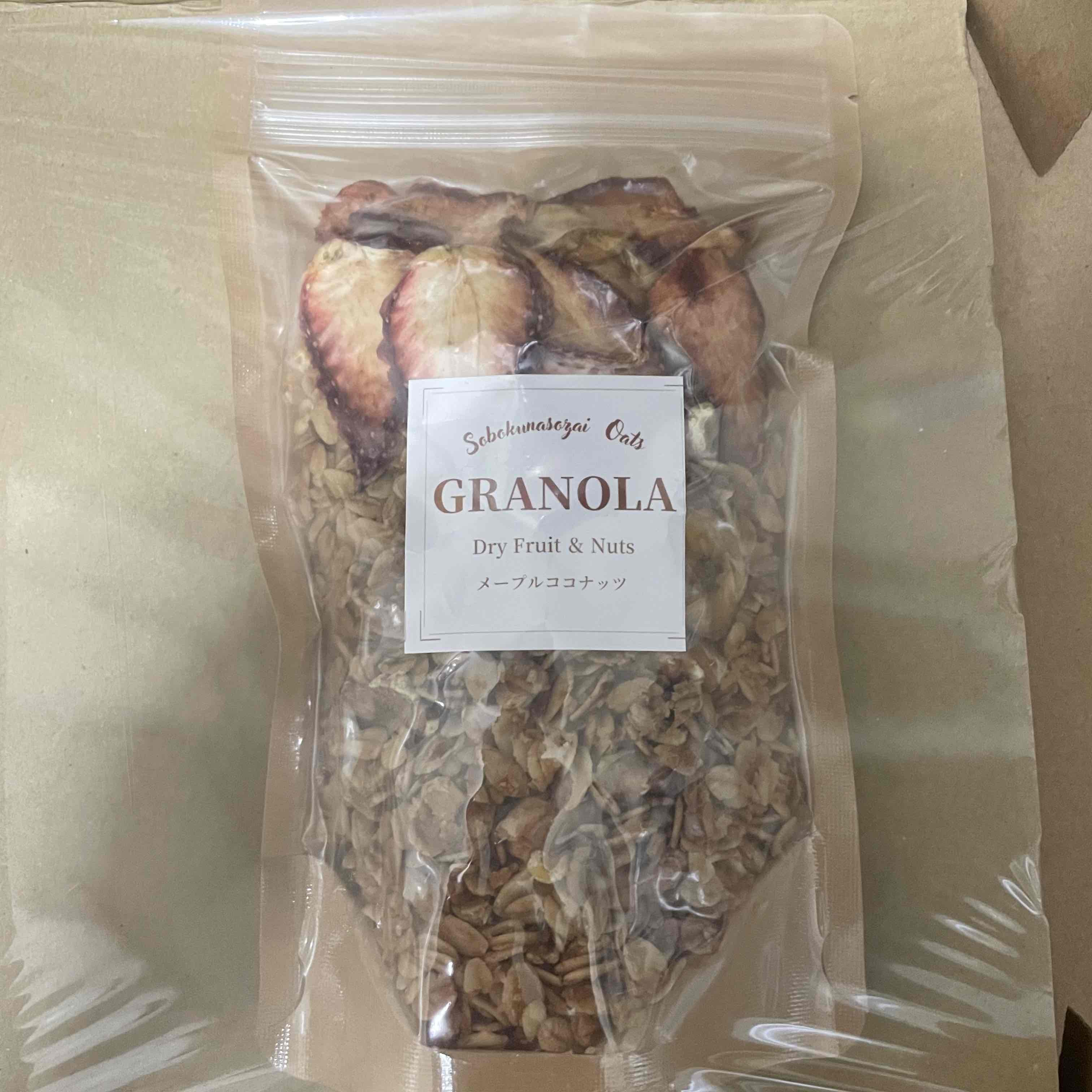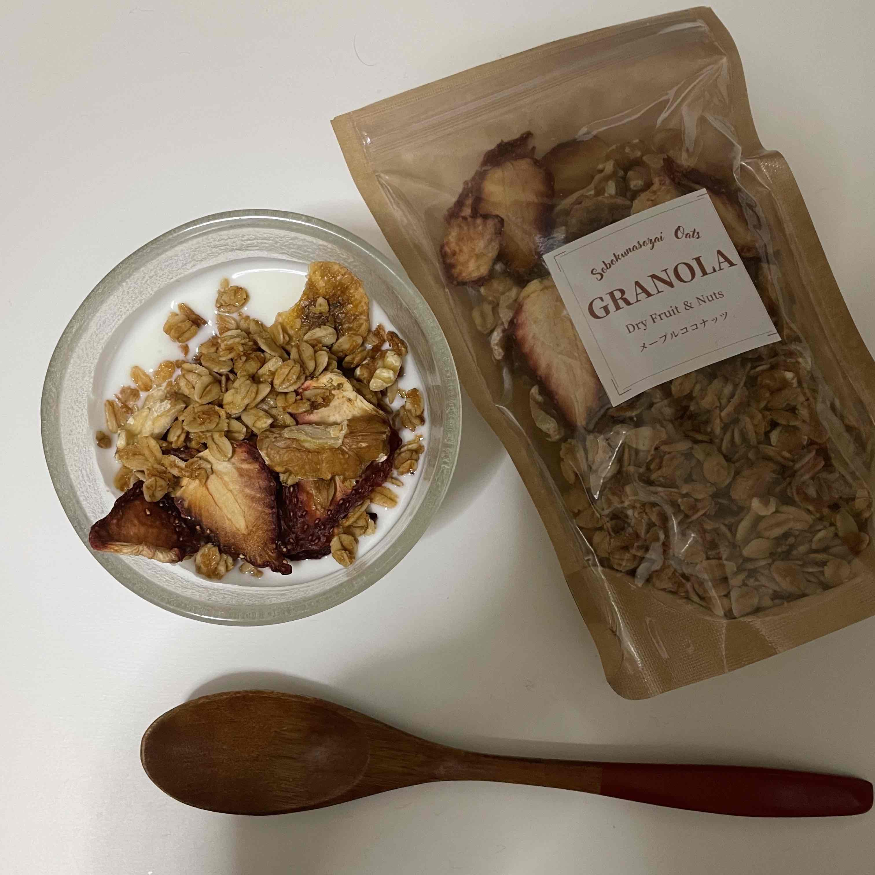 オーツ麦を使用したザクザクとした食感の「グラノーラ」です。ゆっくりじっくり丁寧にローストしたナッツや、自家製のドライフルーツを合わせた、食べ応えも食感も満足な商品。大ぶりのドライフルーツは、季節によって内容が変わるので、リピートしても飽きのこない商品。優しい甘さのココナッツメープル味なので朝食だけでなく、小腹がすいた時のおやつにもおすすめです。