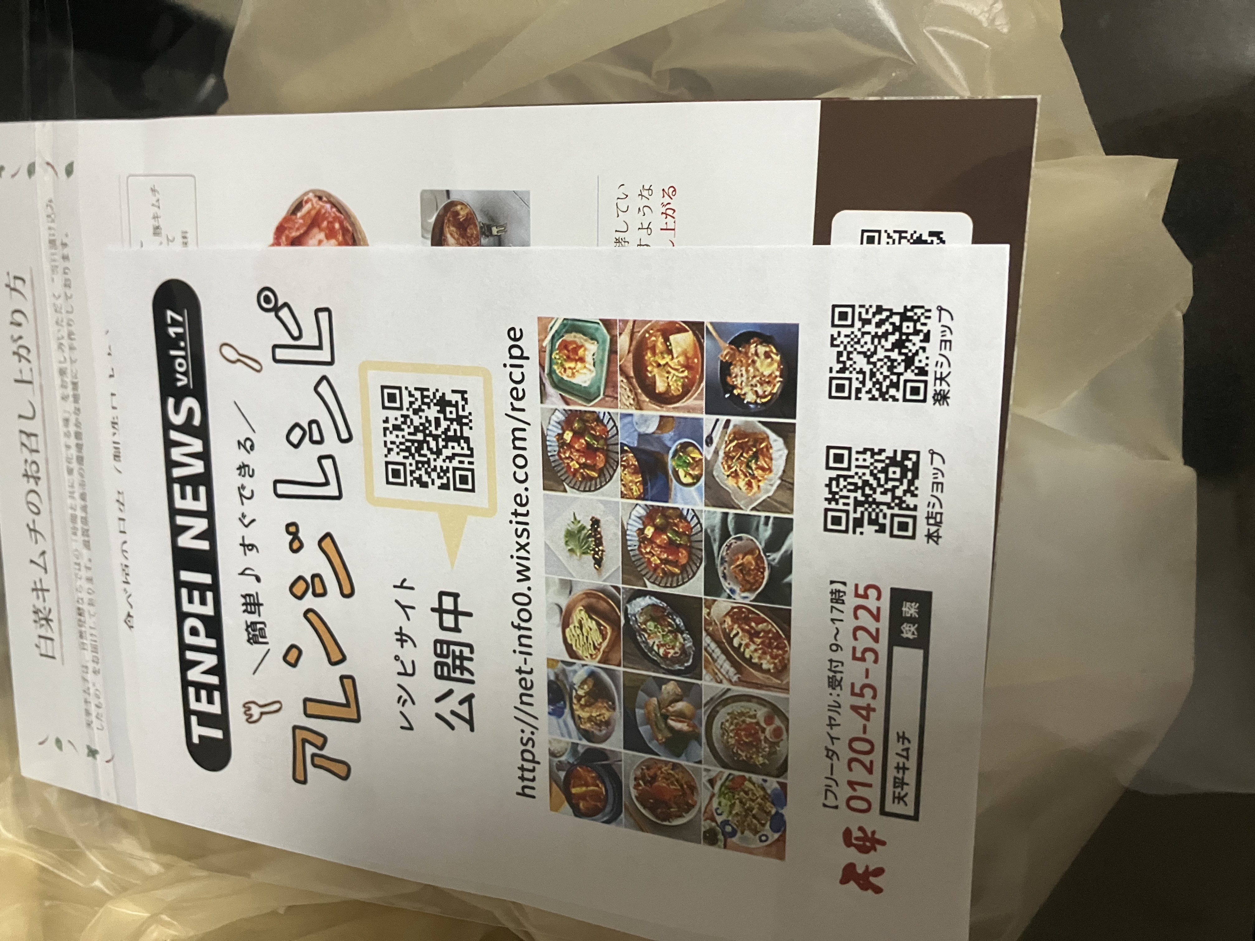 「アレンジレシピ」の案内等、4枚のリーフレット、更に、「感謝」と書かれたカードが、防水性の袋に保護されて添えられていました。丁寧です。