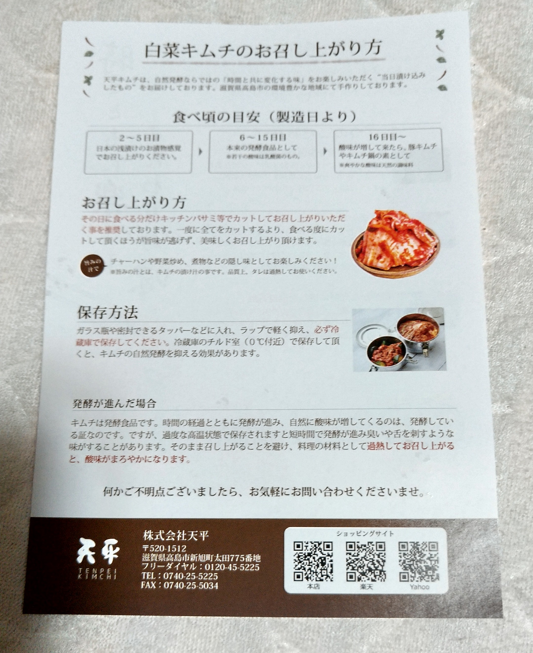 印象的だったのは、「キムチ」のお取扱い説明書に、「キムチは暑がりで、5℃以上の場所が苦手です。暑い所に長時間いると、一気に沢山のガスを出し、涼もうとします。」と、キムチを擬人化した表現で書かれていた点で、❝「天平キムチ」は、自分たちが手塩にかけて育て上げてきた生き物である❞という愛情が伝わります!