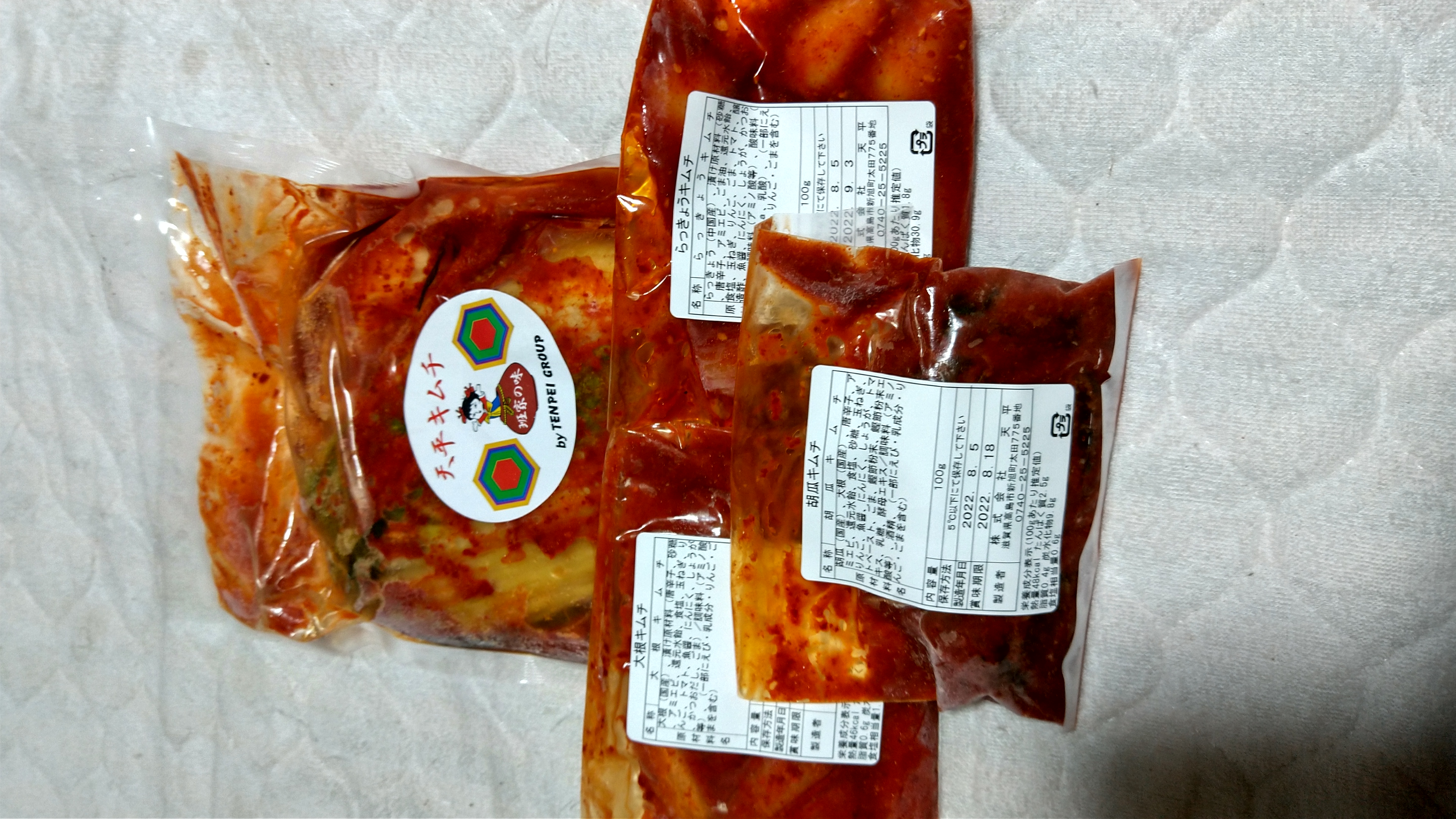 胡瓜キムチ(100g)、らっきょうキムチ(100g)、計4種各1個と、それに、「天平キムチ」の紹介、「キムチ」お取扱い説明書、「白菜キムチのお召し上がり方」や