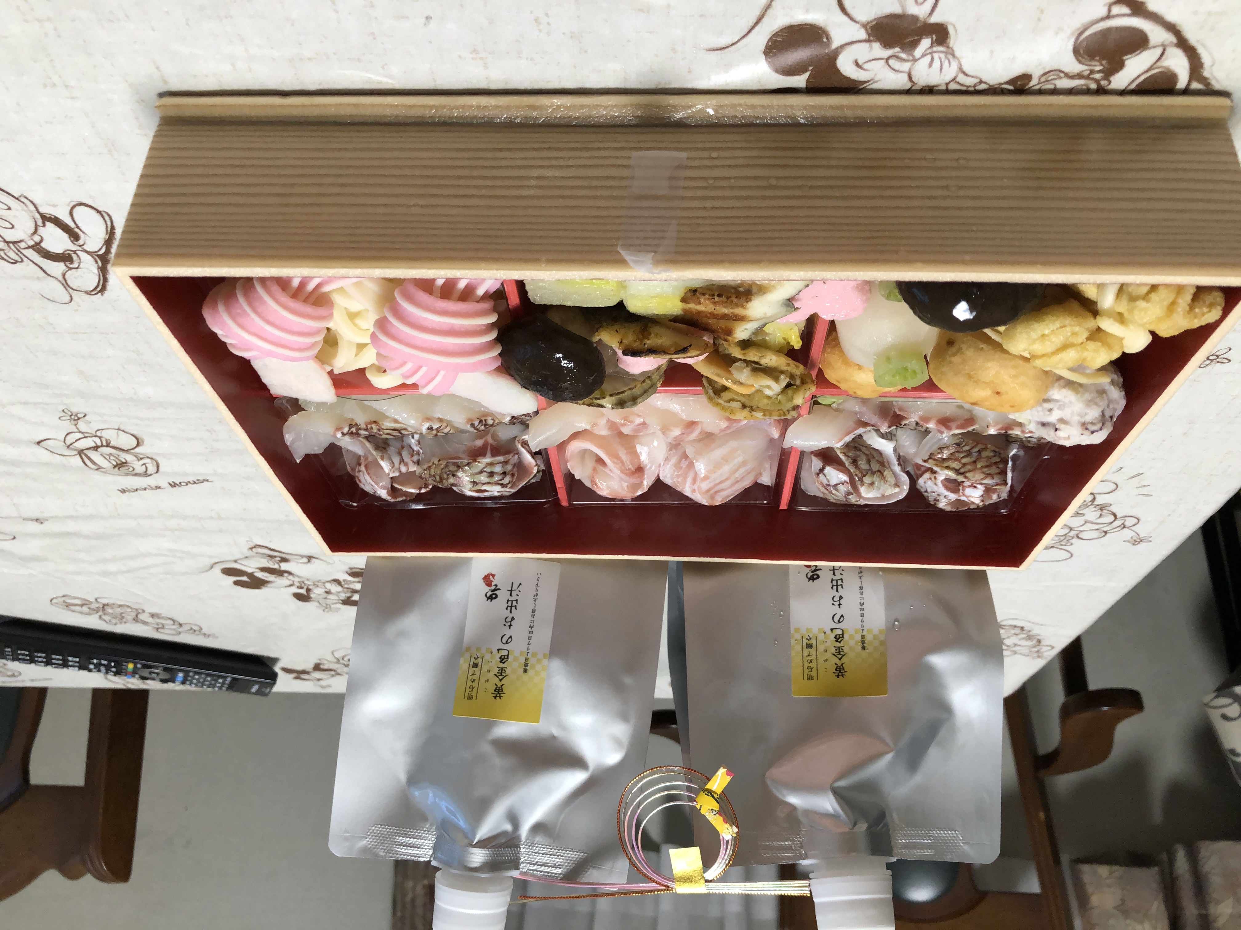 塗のお重に見立てた容れ物は安っぽくないし、紅白結びのかまぼこ、縁起物の巾着、鯛は皮つきと皮なし2種で紅白を表し、水引も添えてあります。