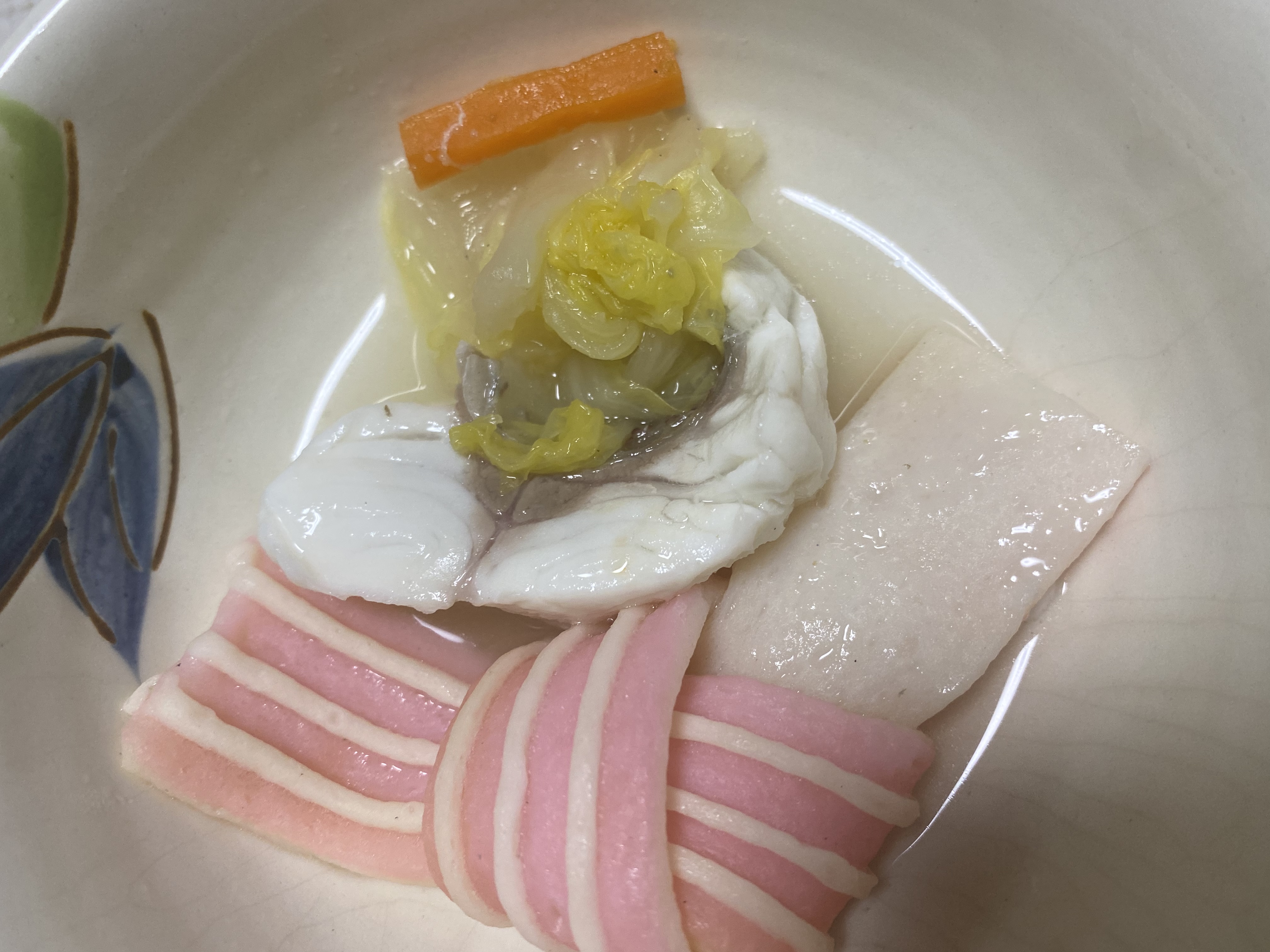 3人で食べるには多すぎると判断し鯛1パックと餅巾着は冷凍キープ、そこに水菜を入れました。水菜は付属ではありません。