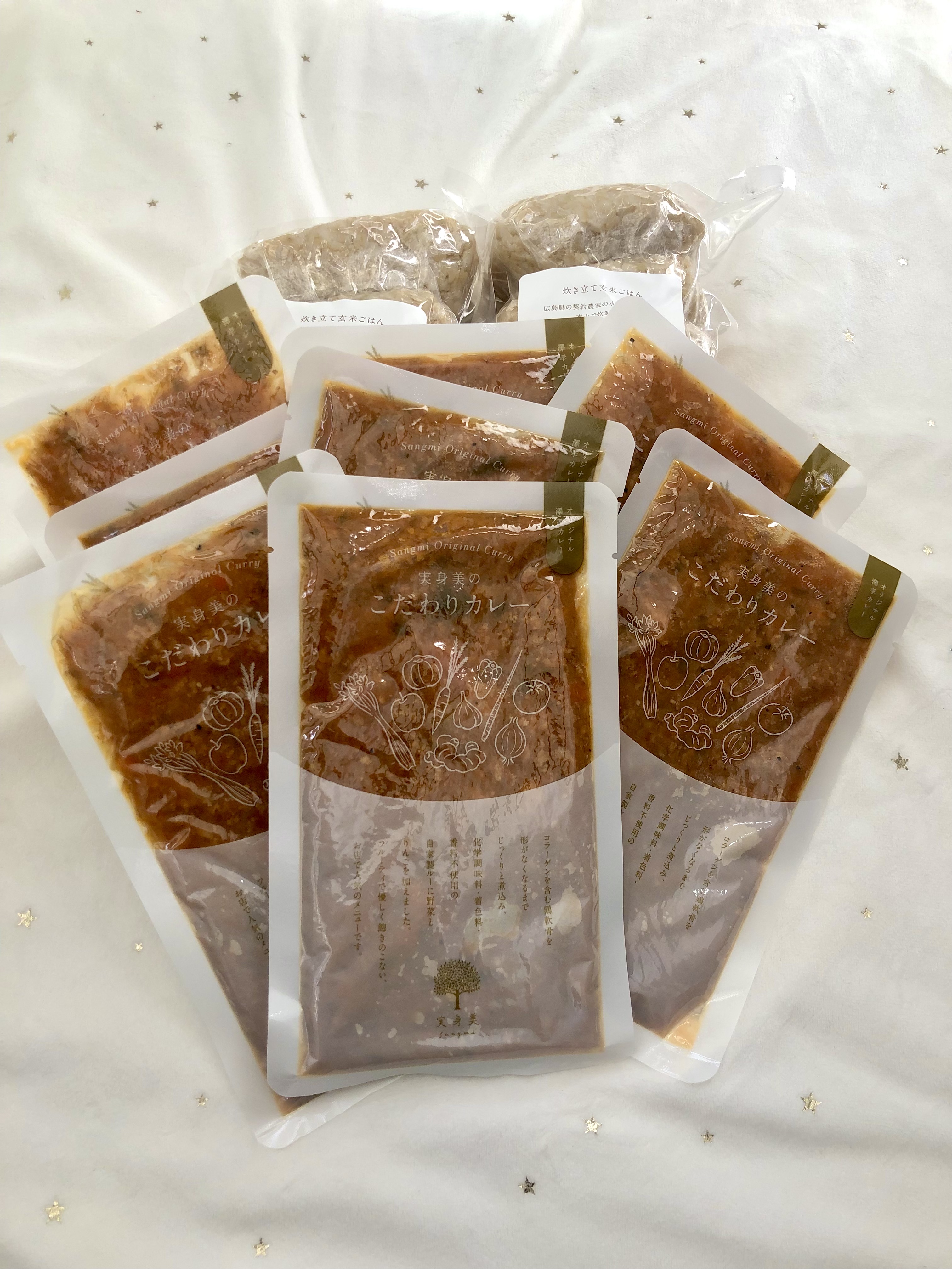 炊き立ての「玄米ごはん」と相性抜群の「キーマカレー風カレー」のセットです。「キーマカレー風カレー」には、じっくり煮込んだ自家製のルーに、たっぷりの野菜とりんごを加えています。スパイスは、ガラムマサラとブラックペッパーのみで、辛さ抑えめのマイルドな味わいです。「玄米ごはん」は、広島県の農家が、土つくりからこだわって育てた特別栽培米を使用。自然塩を入れて直火で炊き上げているので、直火ならではのもちもちした食感と香ばしさが楽しめます。「玄米ごはん」と「キーマカレー風カレー」がセットになり個包装で8食分届くので、大人数でも一人ご飯にも利用でき便利です。