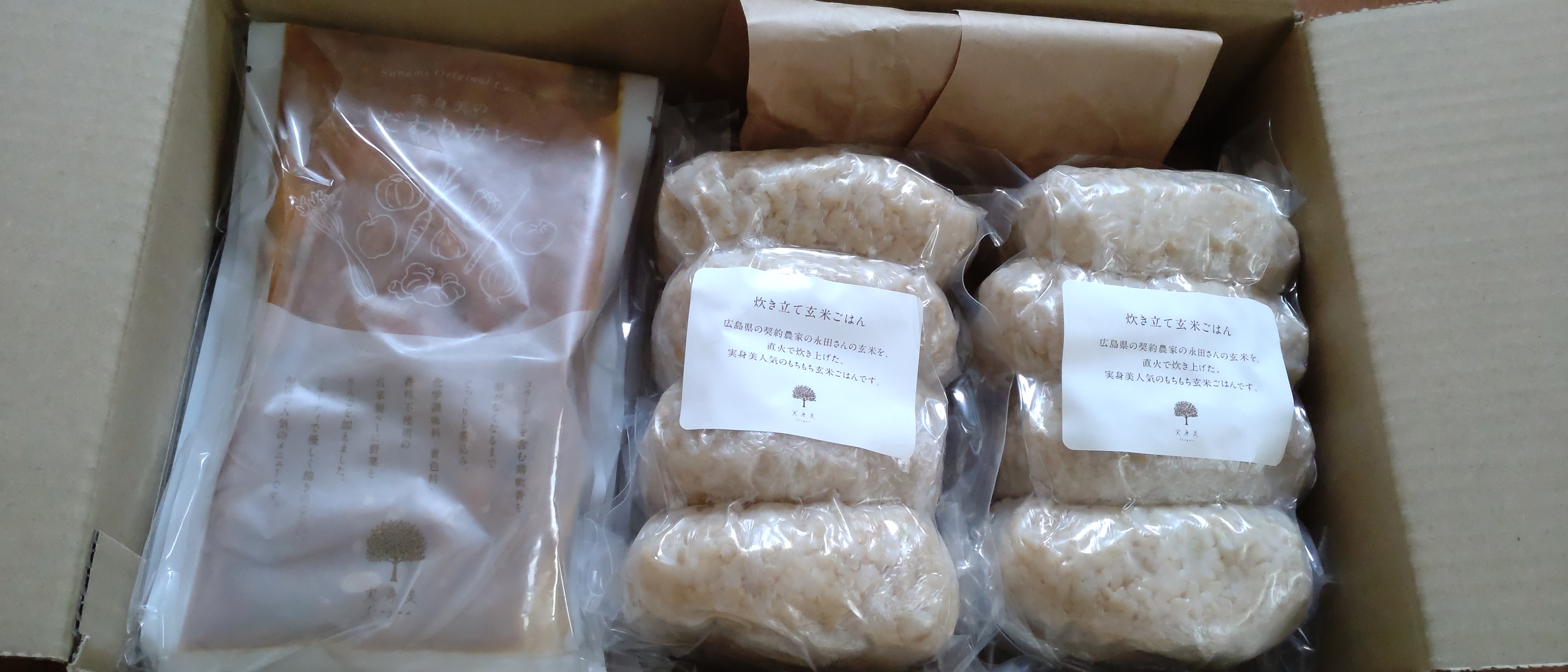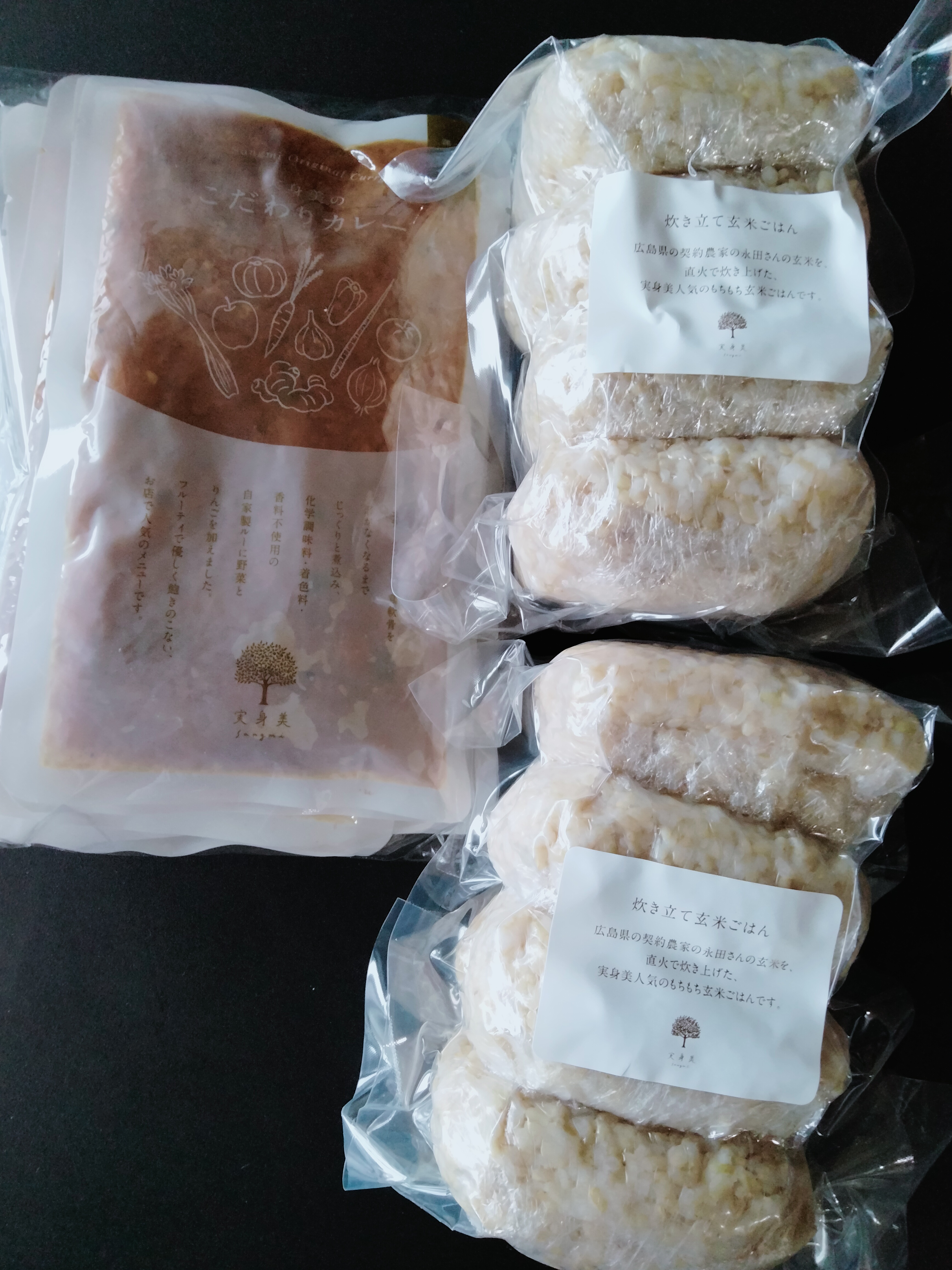 惹かれすぎて事前にホームページの詳細をガン見していたので期待通りの玄米とカレーのセットが指定通りの時間に届きました♪即開封です!