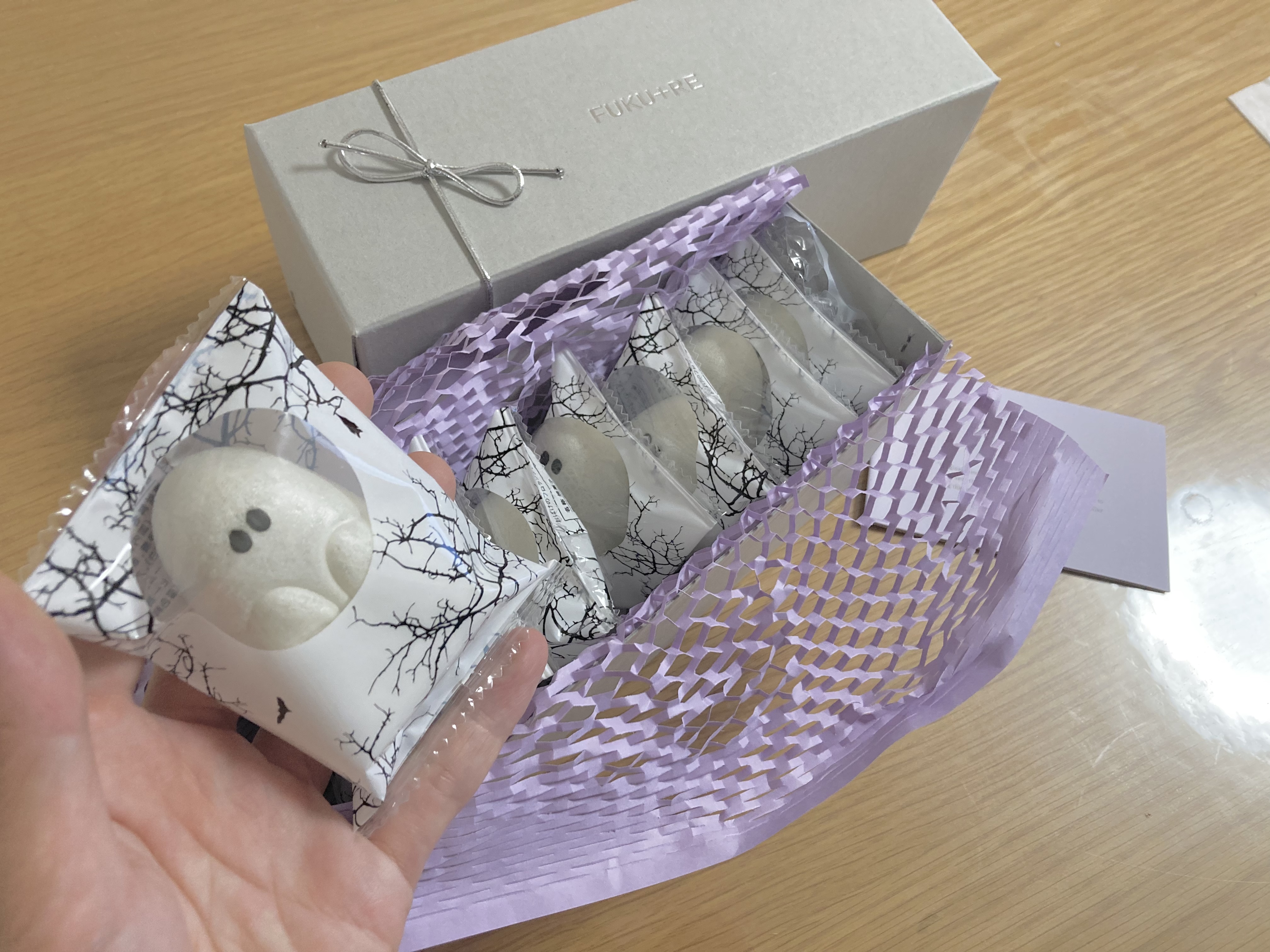 シンプルなグレーの箱に入っているのでオシャレな手土産にもいいんじゃないでしょうか。箱を開けたら1個づつ包装してある可愛いゴースト達!ハロウィンパーティーには盛り上がること間違いないと思います。見た目の可愛さとほろ苦の大人な味のフロランタンのギャップもすごくいいと思いました。