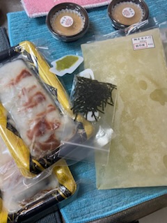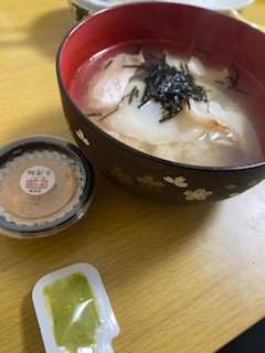 1. 解凍した鯛の身をごまだれとわさびでお刺身としてご賞味ください。(鯛の旨みをお楽しみください)