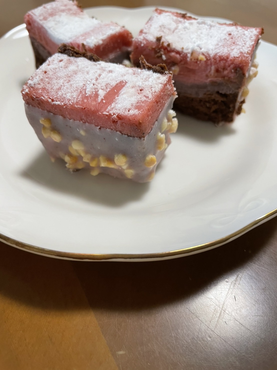 いちごとチョコレートの色が可愛くて見た目が華やかです。切り分けてみると綺麗な二層の断面がでてきます。