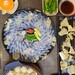 長年の経験を積んだ熟練のふぐ職人が、一枚一枚に心を込めて丁寧に薄造りにした身を大皿に盛り付けたふぐ刺身は、正に豪華という言葉が相応しい逸品です。創業290余年の老舗醤油メーカーとして評判の大津屋特製ポン酢醤油に、薬味として葱ともみじおろしを入れ、2~3枚まとめて一気にお召し上がり下さい。もちもちでぷりぷりの食感と歯ごたえが堪りません。