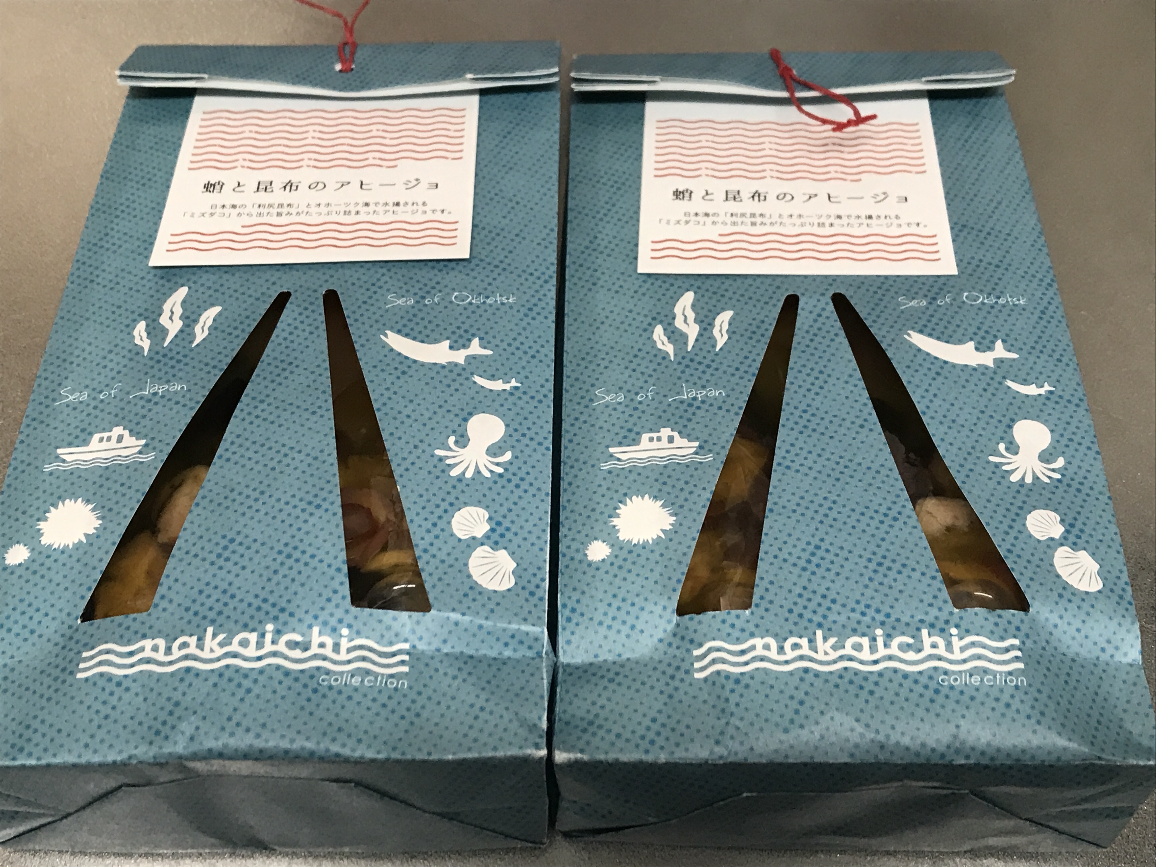 北海道と魚介のイラストが施されたシンプルな可愛らしいパッケージです。