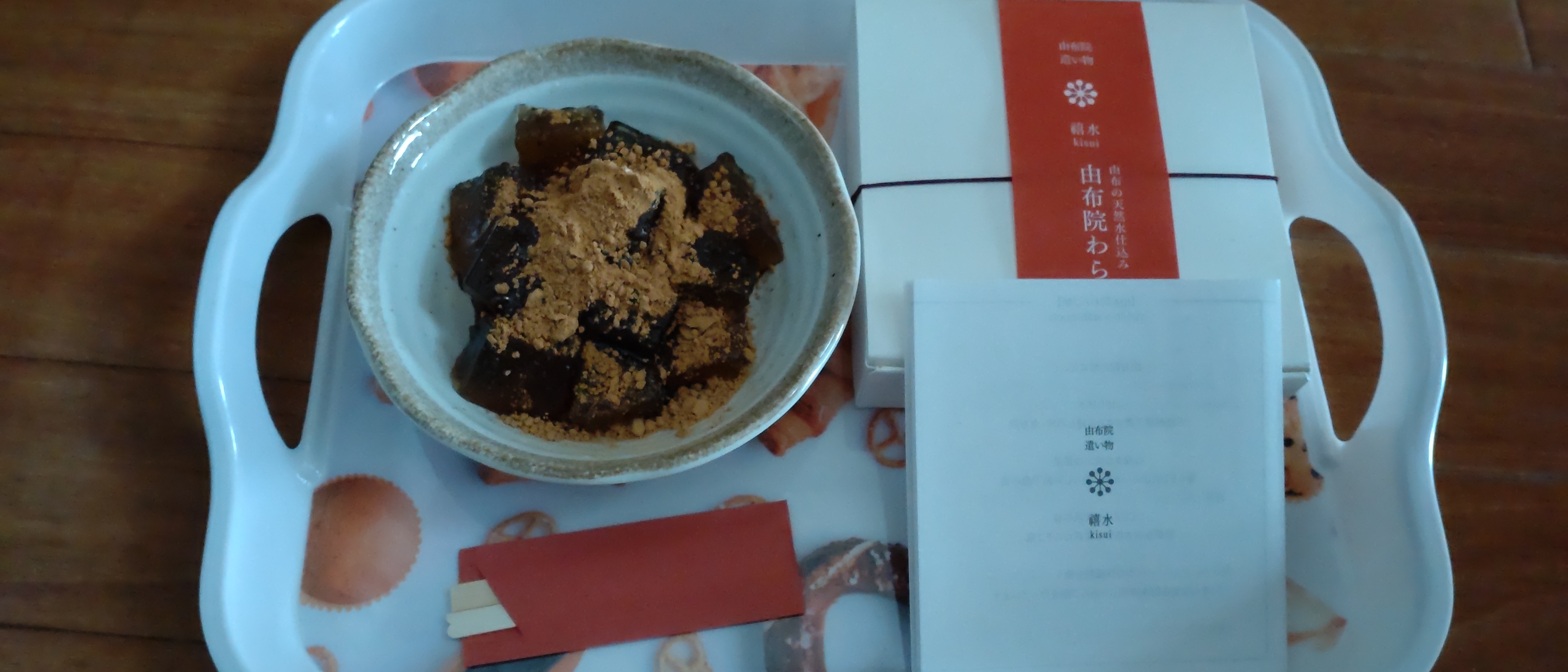 由布院の地下240メートルより湧き出る由布の天然水仕込みのわらび餅です。