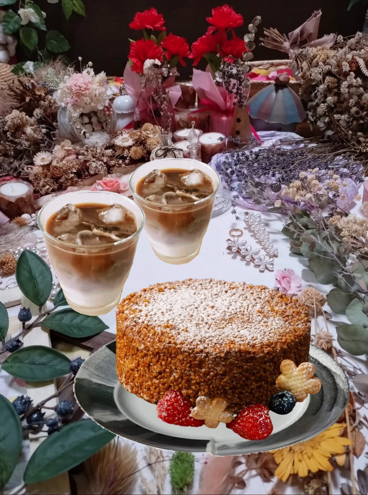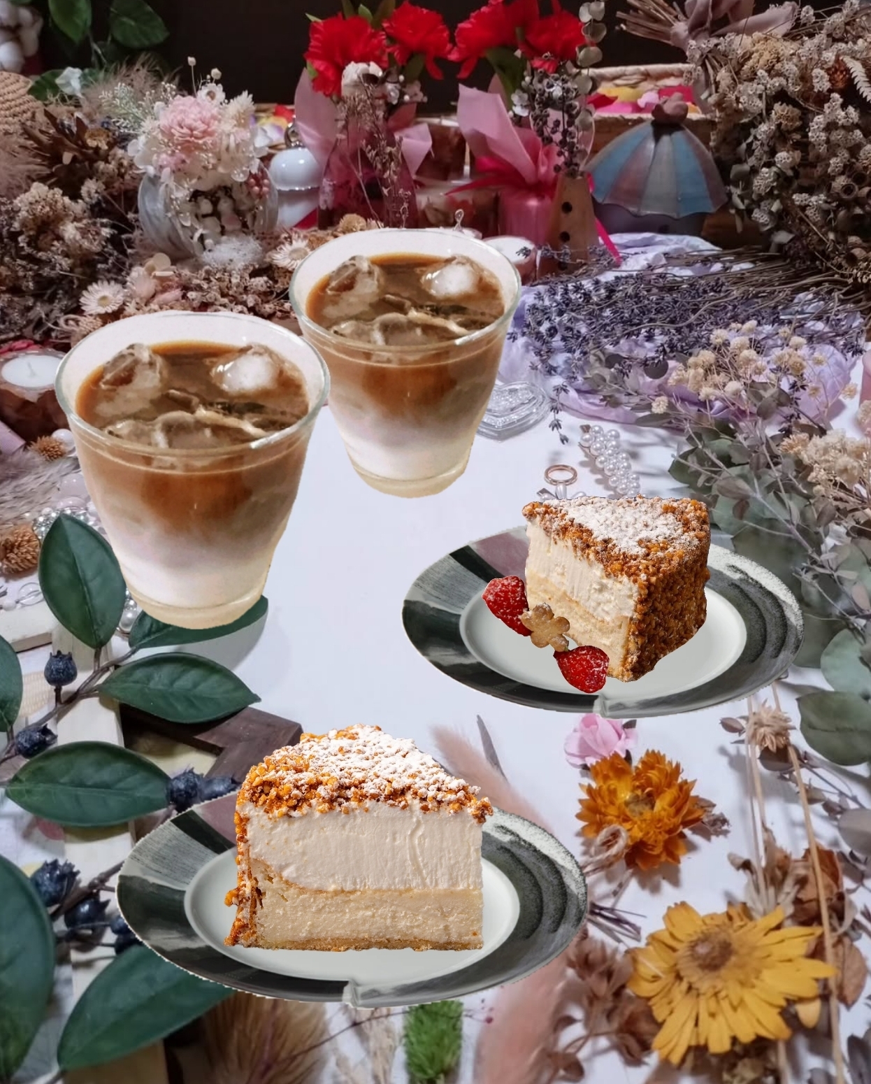休日のおうちカフェでアイスカフェラテと一緒に頂きました。クリームチーズが贅沢に使われた2層のチーズケーキです。下段はなめらかで濃厚なベイクドチーズケーキ、上段は口の中でふわっととろけるレアチーズケーキ。ホールケーキの表面と側面にはアーモンドダイスがたっぷりで、食感と味わいのアクセントになっています。