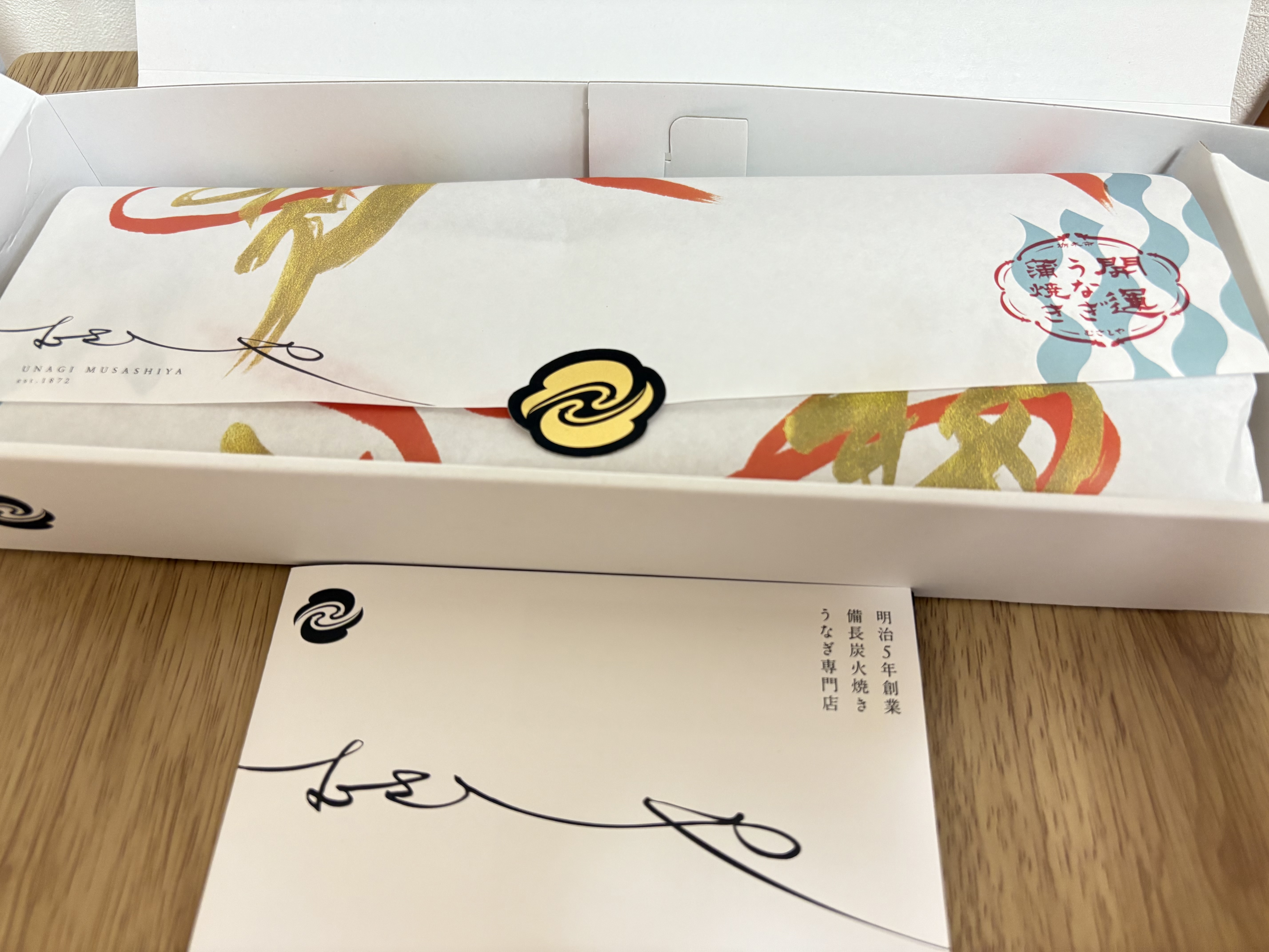 うなぎ蒲焼(長焼き)2本 御朱印付きは、むさしや自慢の蒲焼が冷凍で届く商品で、特別感のある御朱印デザインの包み紙に包まれています。