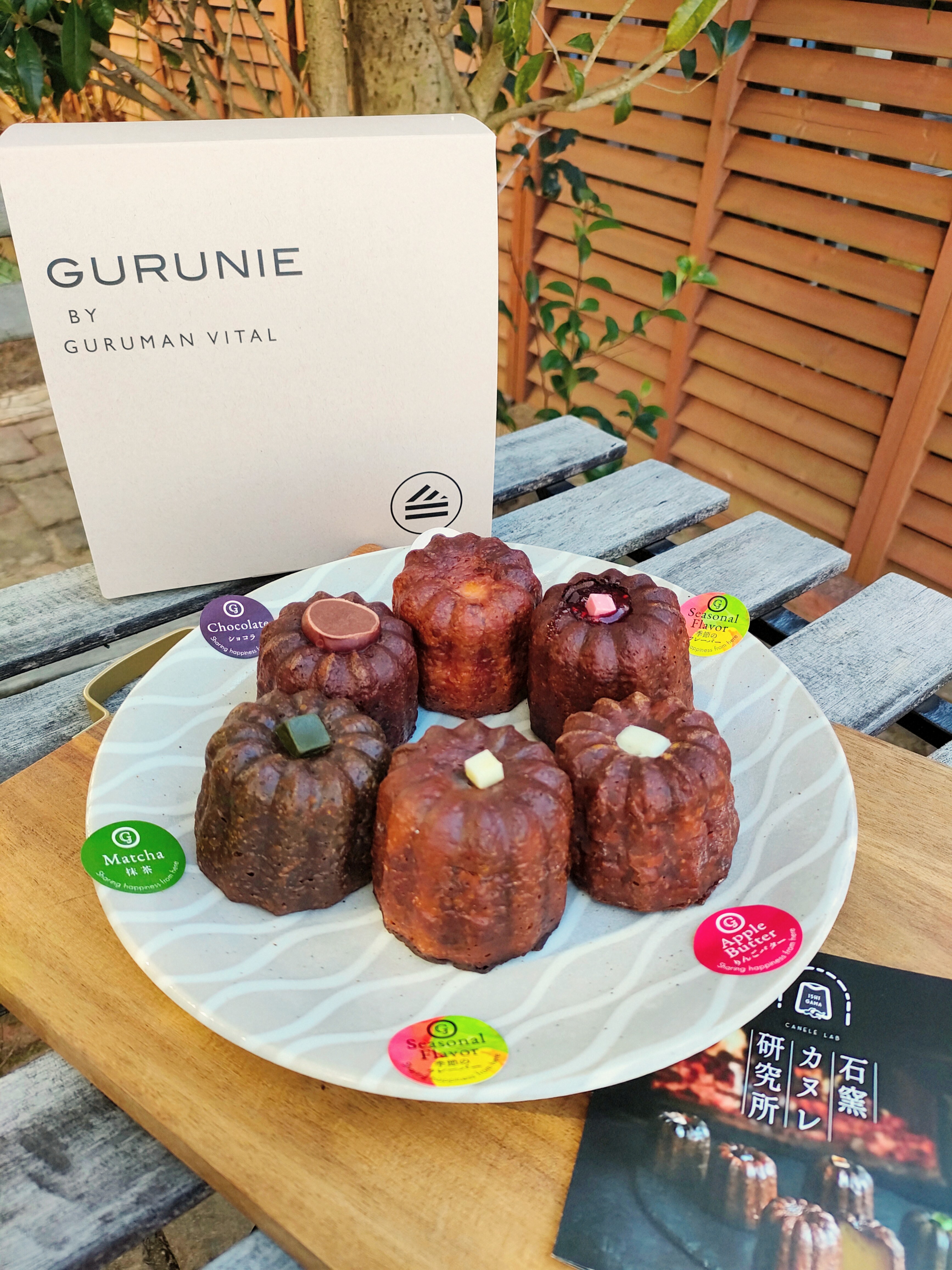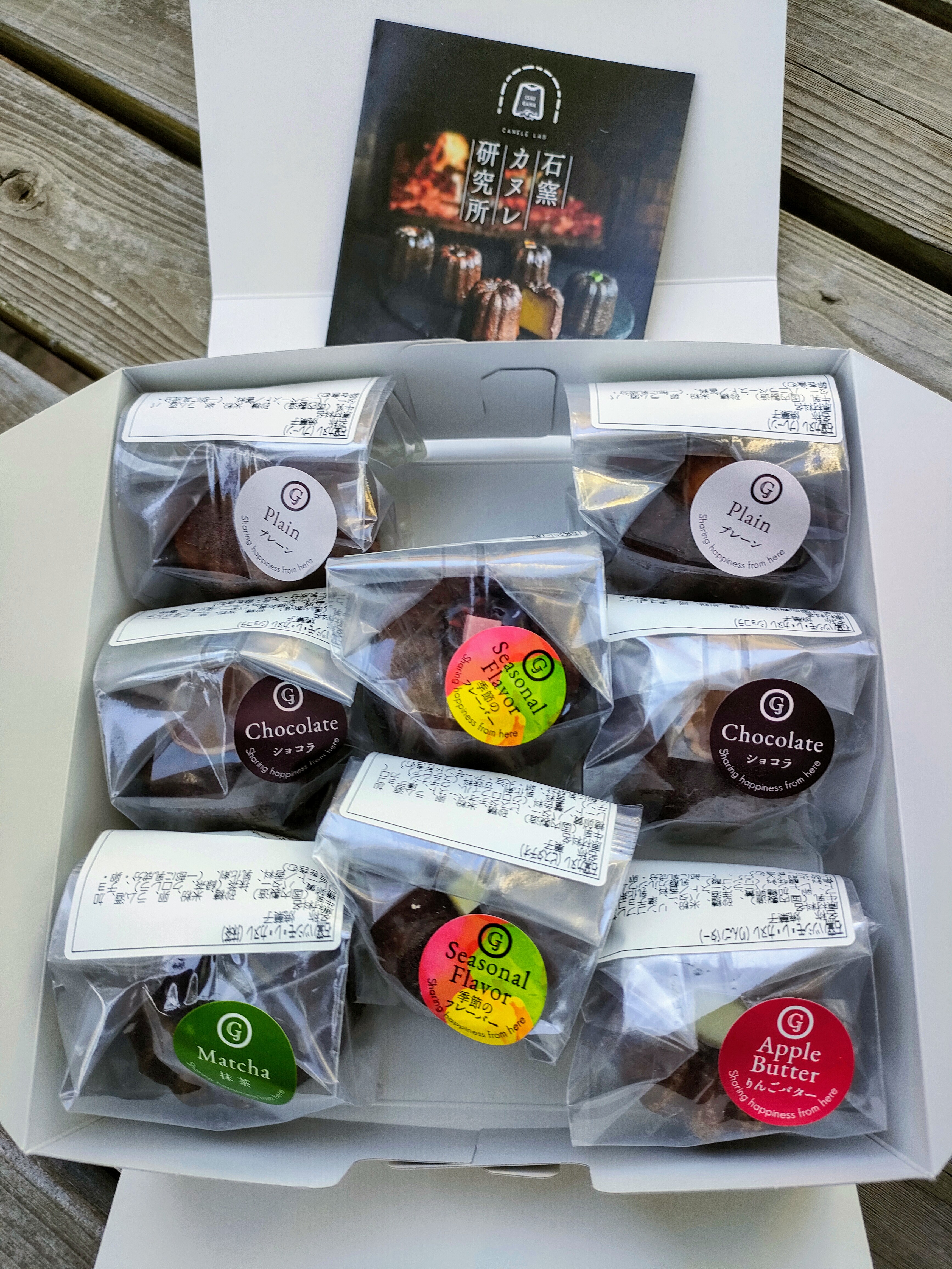 オシャレなBOXに個包装のカヌレ、シールで種類が分かりやすくなっています。