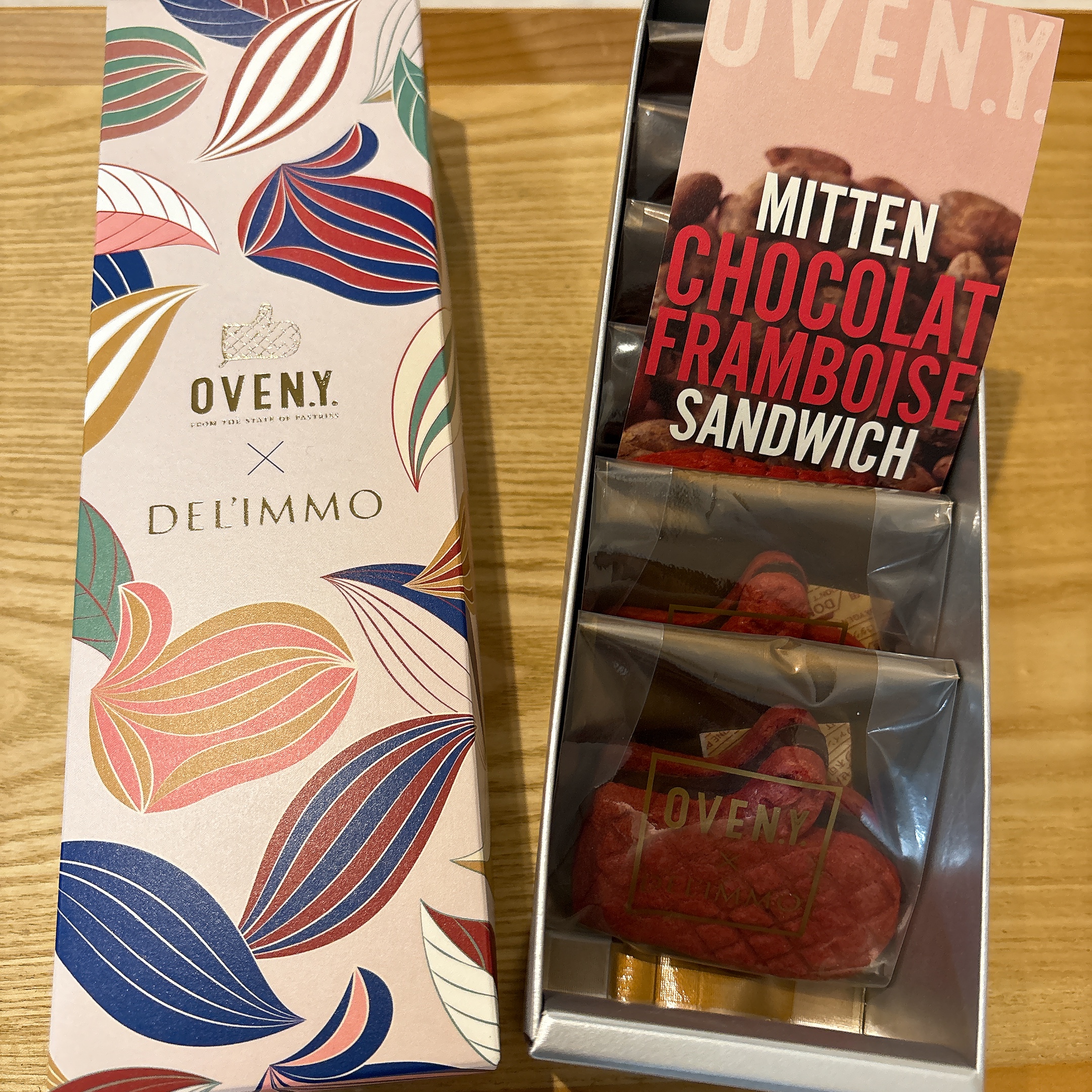 ラズベリー色の赤いミトンの形が印象的な「チョコレートサンド」です。ショコラティエ江口和明氏が手掛けるOVEN.Y.(オーブンニューヨーク)のラズベリー色のミトンサブレに、ビターチョコレートと甘酸っぱいラズベリーソースをサンドしています。可愛らしいミトンモチーフのイラストが描かれたパッケージで届くので、贈り物にもおすすめです。