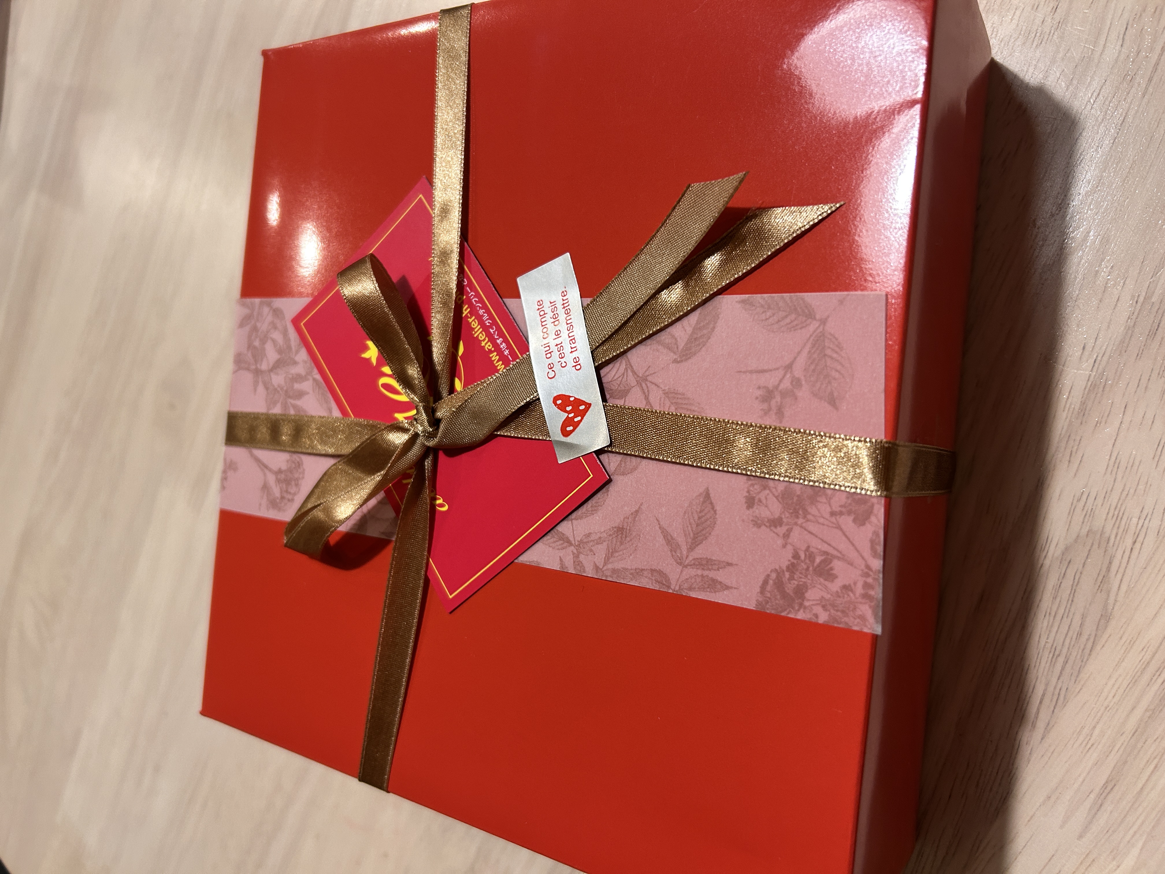 まずは白い段ボールを開けると、リボンや花柄のペーパーで綺麗にあしらわれている可愛い化粧箱が。