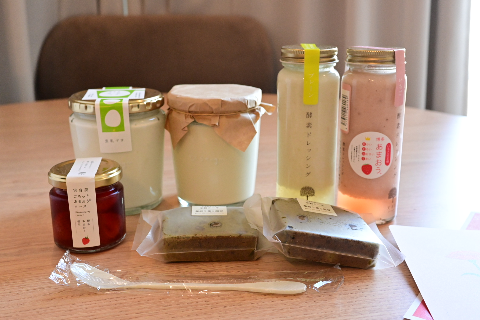 食卓を彩る酵素ドレッシングはサラダかけてさっぱりと。豆乳マヨはパンや温野菜に添えて軽やかな一皿に。あまおうソースをたっぷりかけた豆乳プリンと釜炒り茶と黒豆のパウンドケーキでゆったりとしたおやつ時間をお楽しみいただけます。