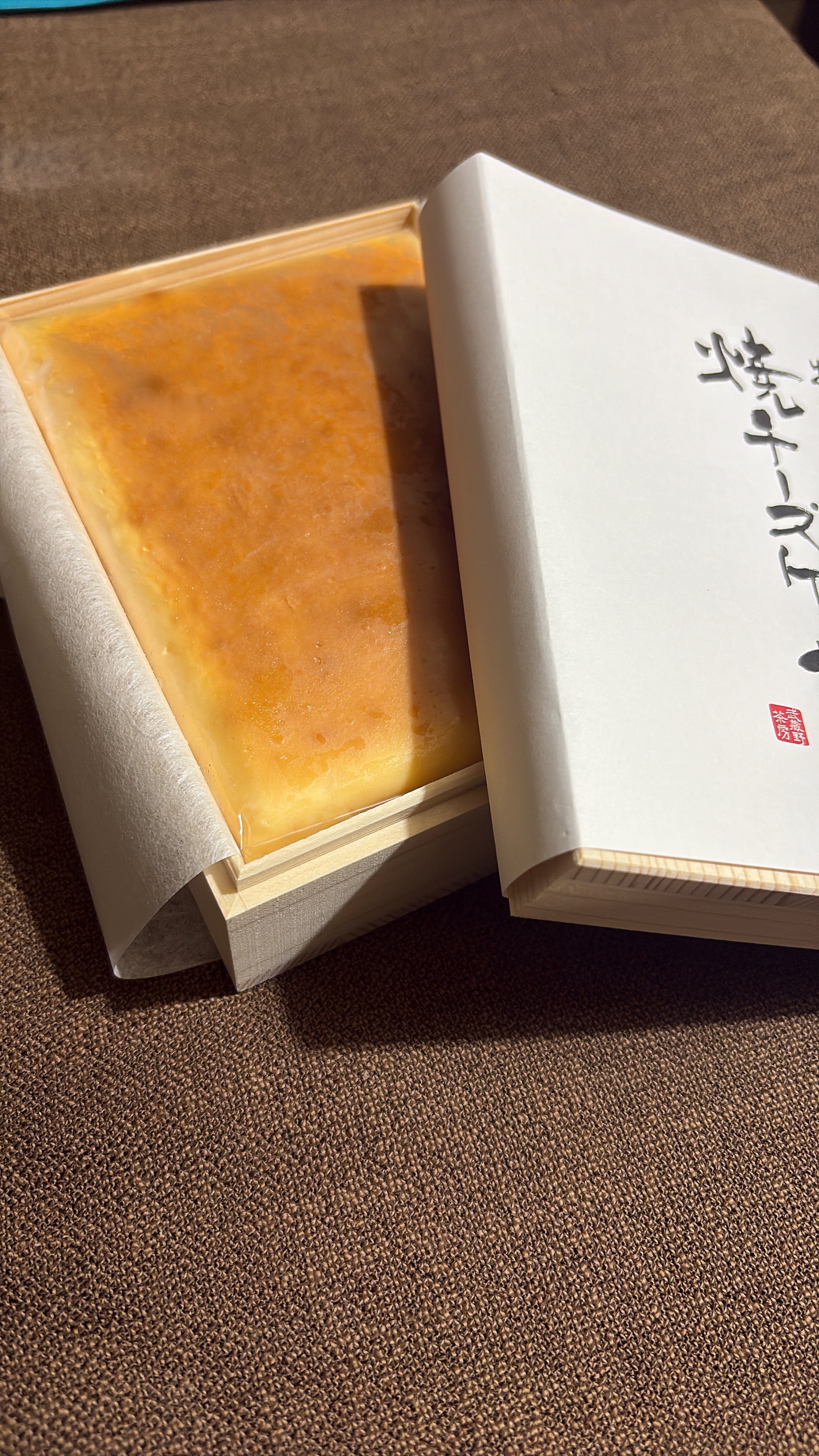 木箱を開けると、箱いっぱいの四角いチーズケーキ。