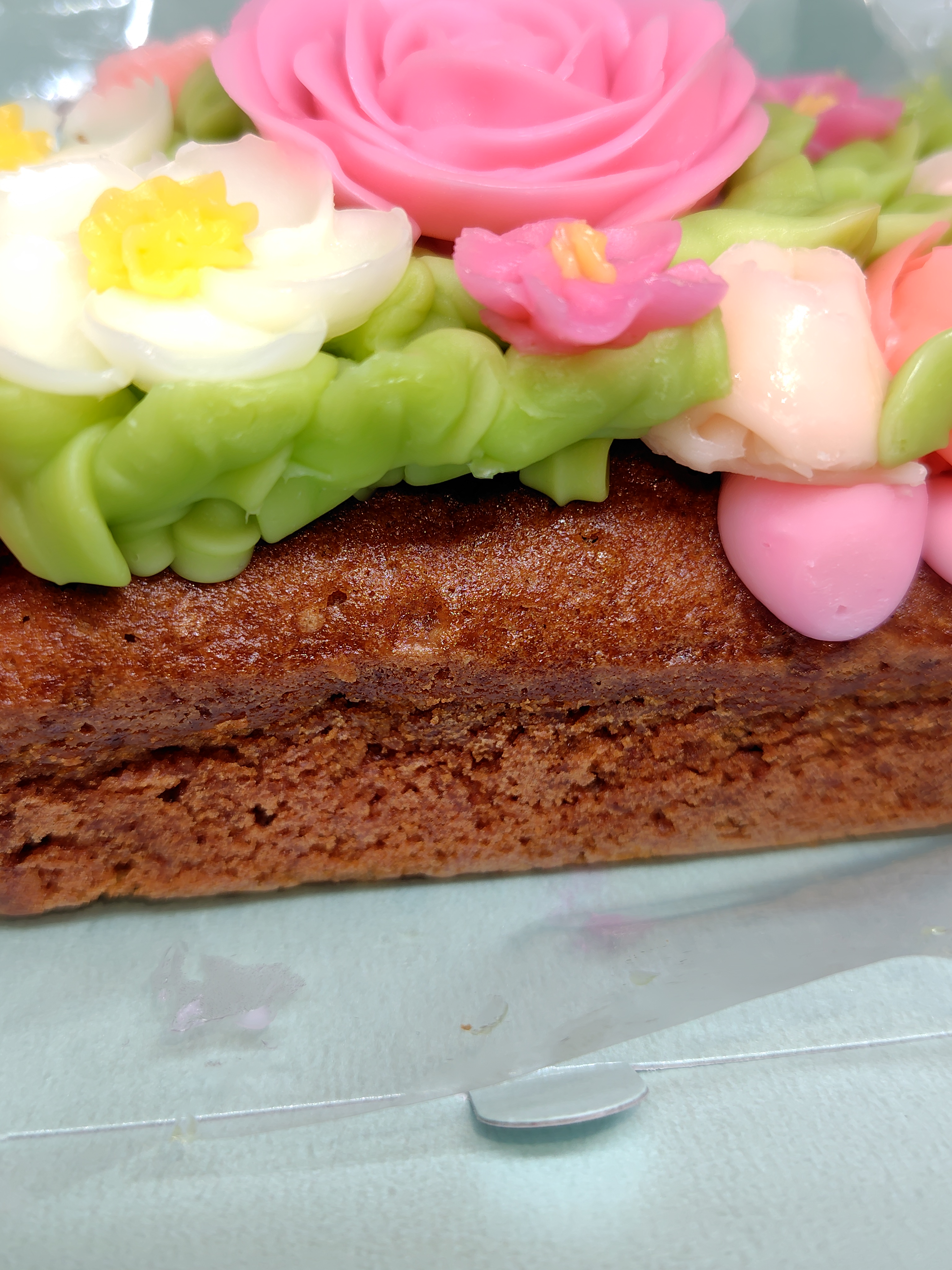 スポンジ部分は、シナモンの香りが心地良く、しっとりしています。にんじん感は余りせず、クランベリーが甘酸っぱく、バタークリームのお花と一緒に頂くと本当に
