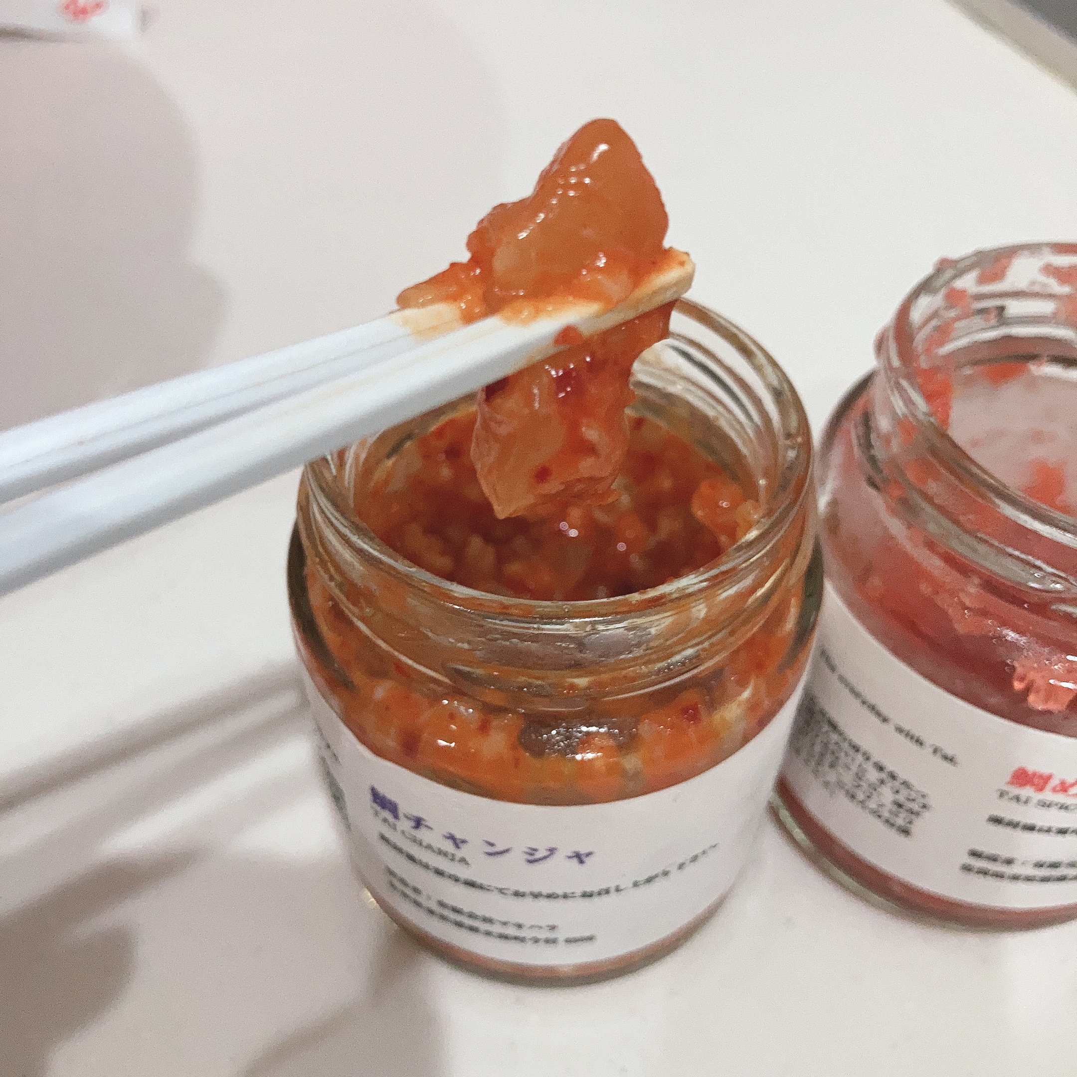 韓国の珍味チャンジャに真鯛の切り身が入っています。