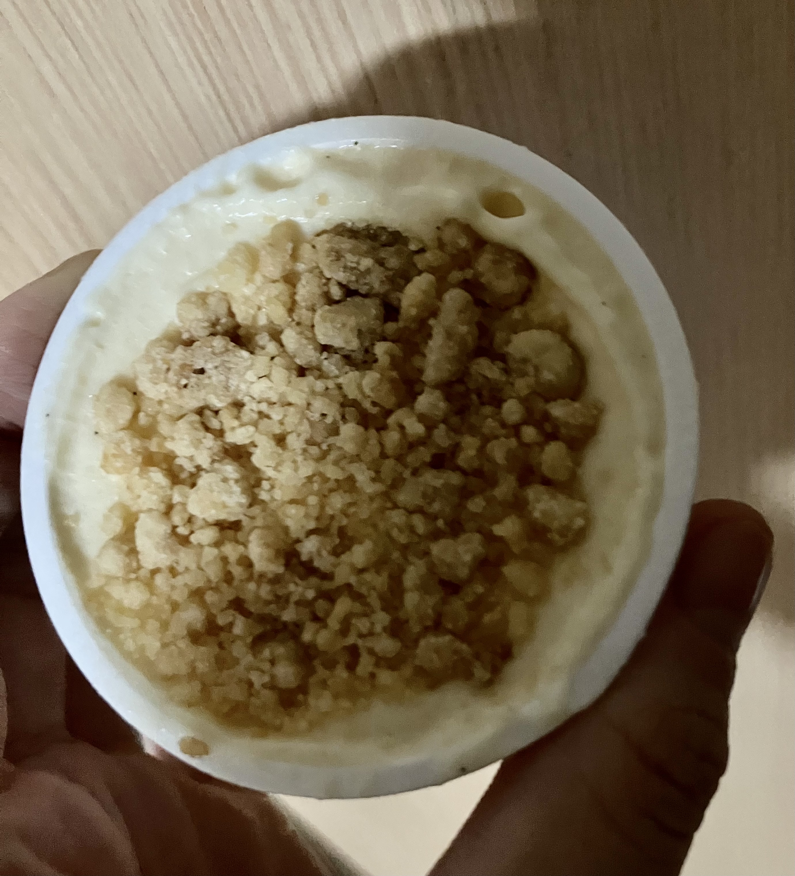 蓋を開けるとクランブルがたっぷり載っており、本当にチーズケーキがそのままアイスになったようなビジュアルにうれしくなりますね。チーズ工房さんが厳選した3種のチーズを組み合わせているので、チーズの香りや奥深い味わいが楽しめ、甘さは程よくチーズのコクと旨みが際立っているように感じます。クランブルのサクサク食感もクセになり、一口もう一口と手が止まらなくなるおいしさです。