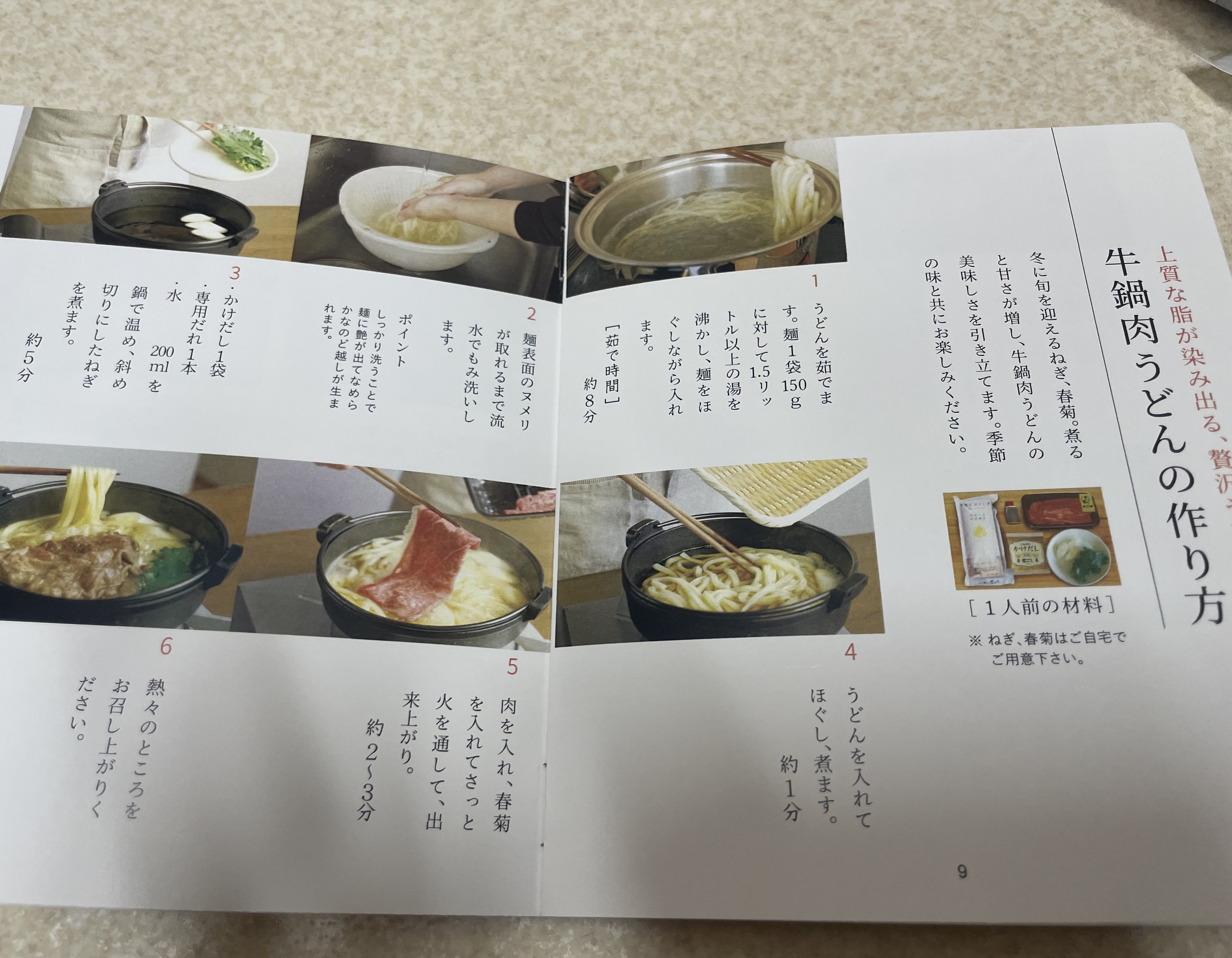 今回は、秘伝書のなかでも、最初に書かれていた極上肉うどんを作りましたが、他にも牛鍋肉うどんの作り方、牛鍋肉うどんの楽しみ方なども載っていて、もっと食べてみたい~!と思いました。また、それぞれの素材のことなどが書かれていて、素材へのこだわりが感じられました。