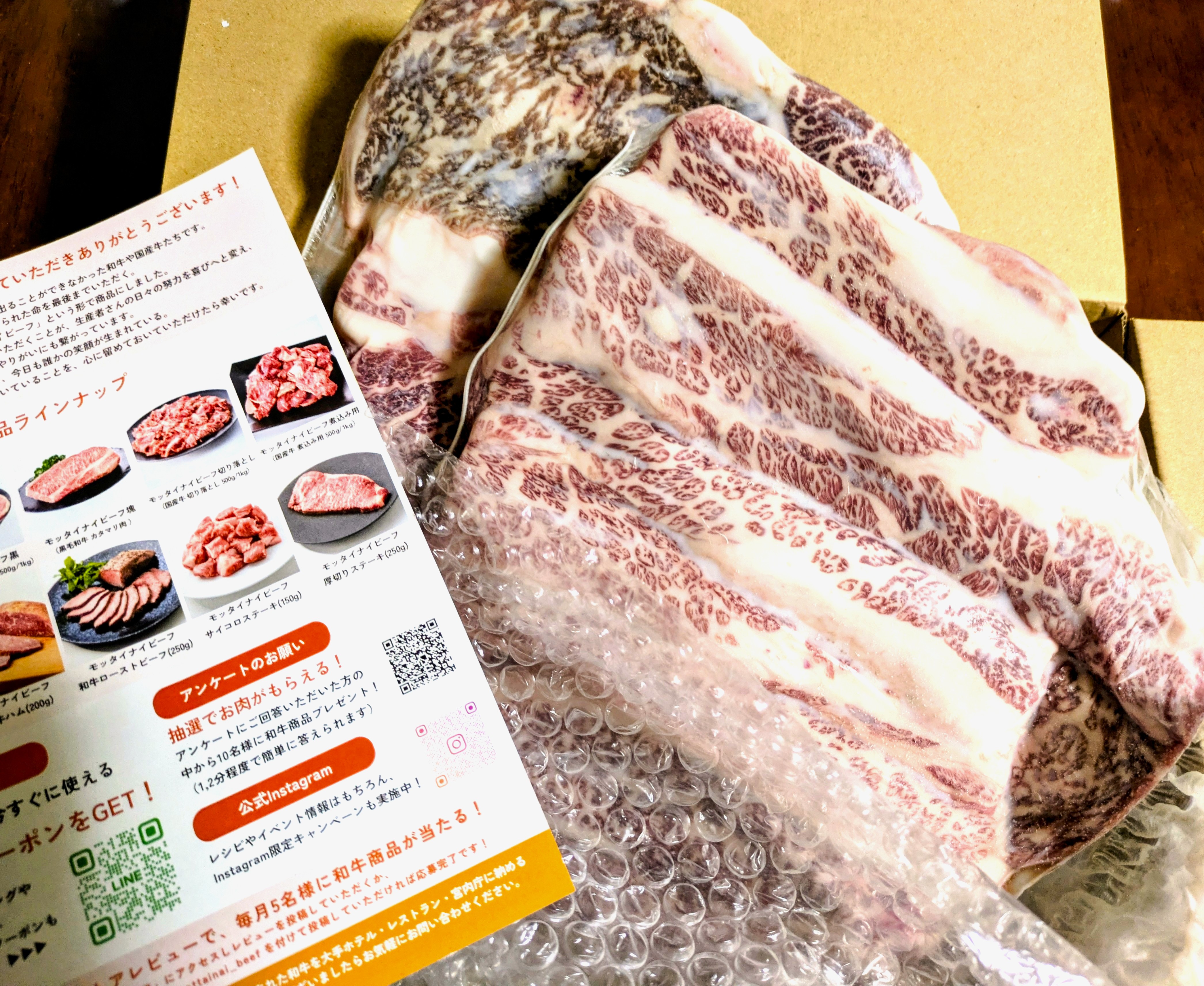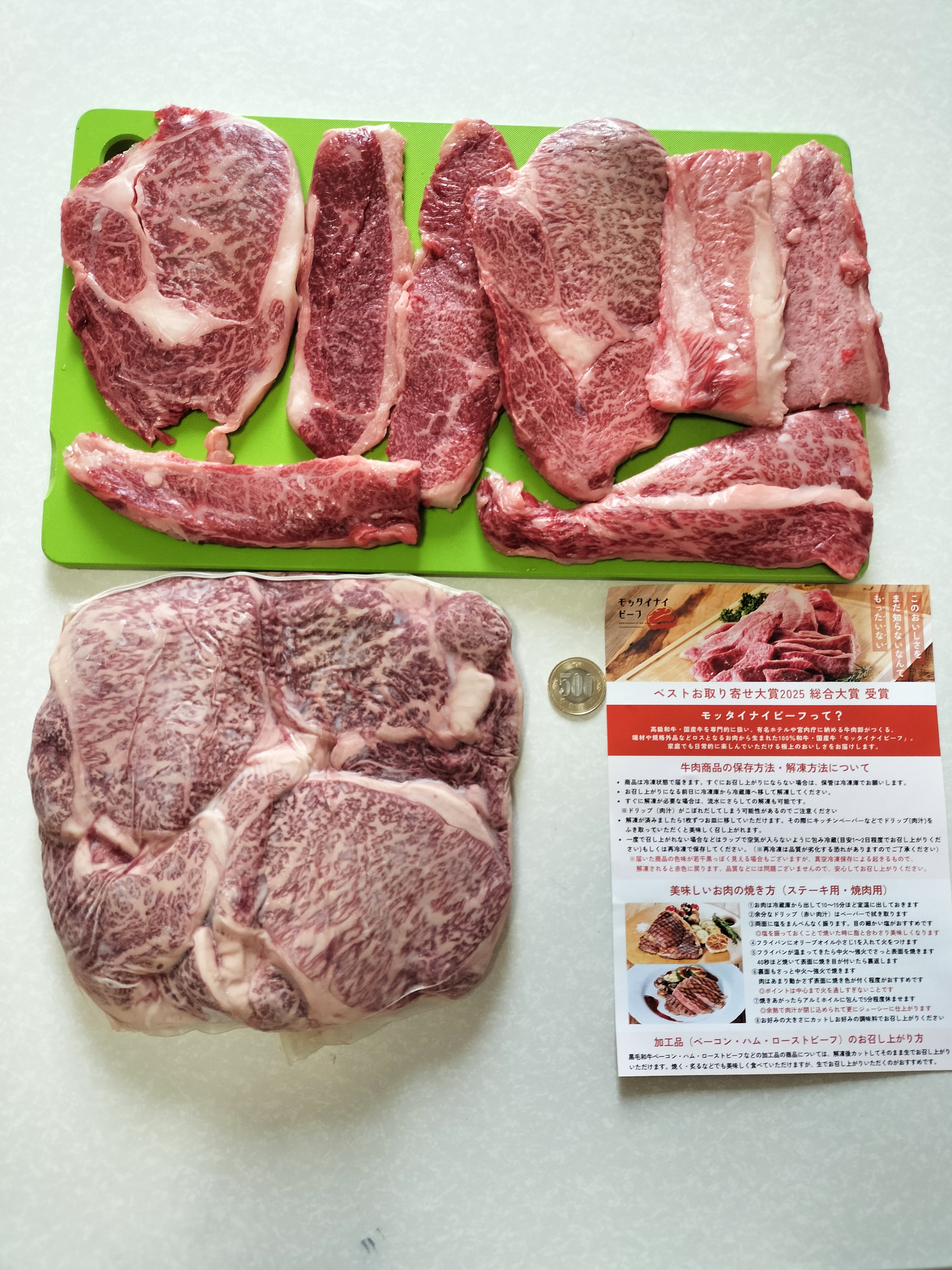 まず届いて感じたのは、500gずつの小分けになっている使いやすさです。1kgのお肉というと一見多く感じますが、小分けされていることで冷凍庫にも収納しやすく、必要な分だけ解凍できるのが本当に便利です。賞味期限も長く、ストック食材として安心して常備できる点も嬉しいポイントです。解凍方法や、美味しいお肉の焼き方も同封されており、主婦としては非常に助かります。