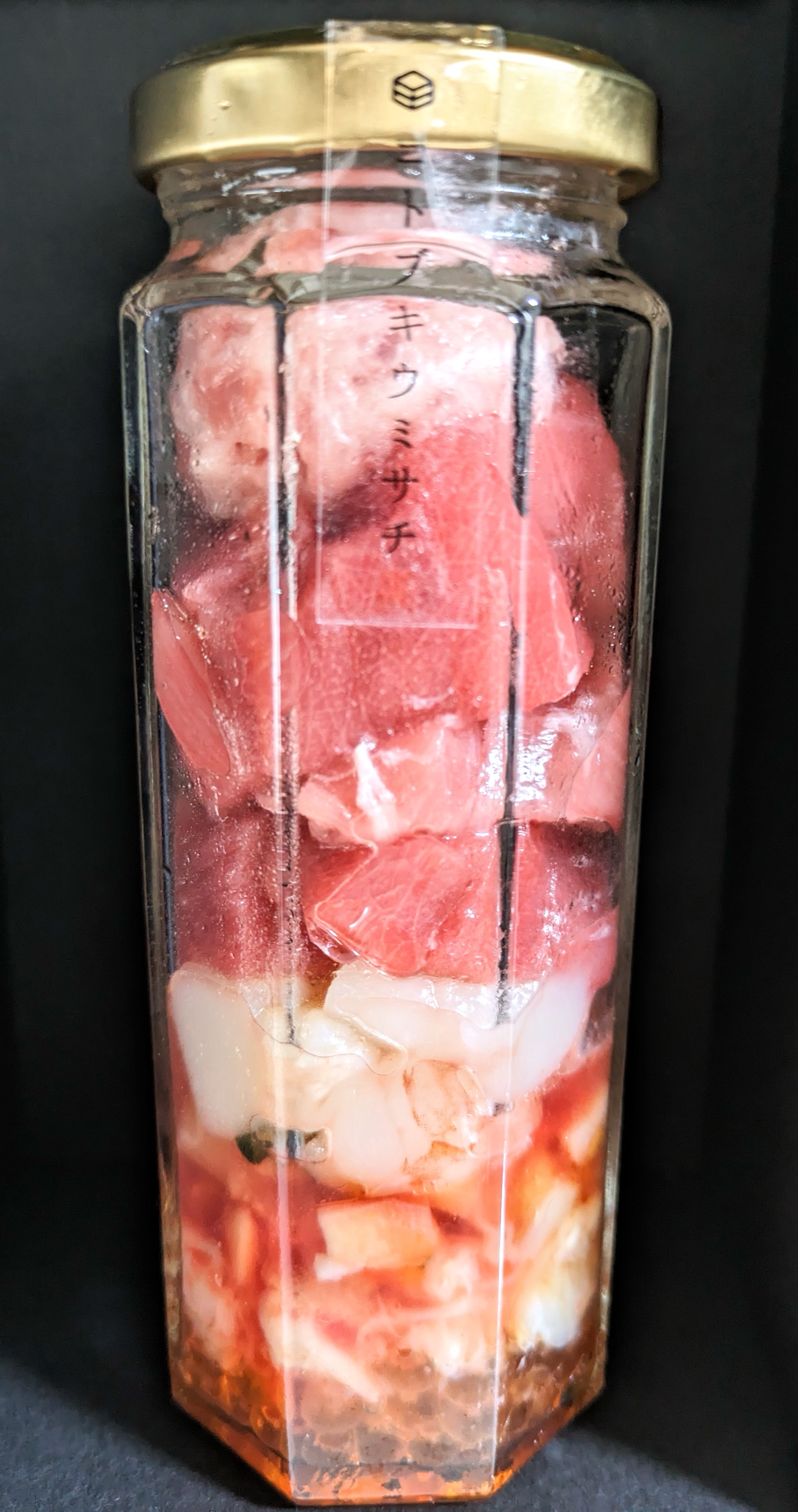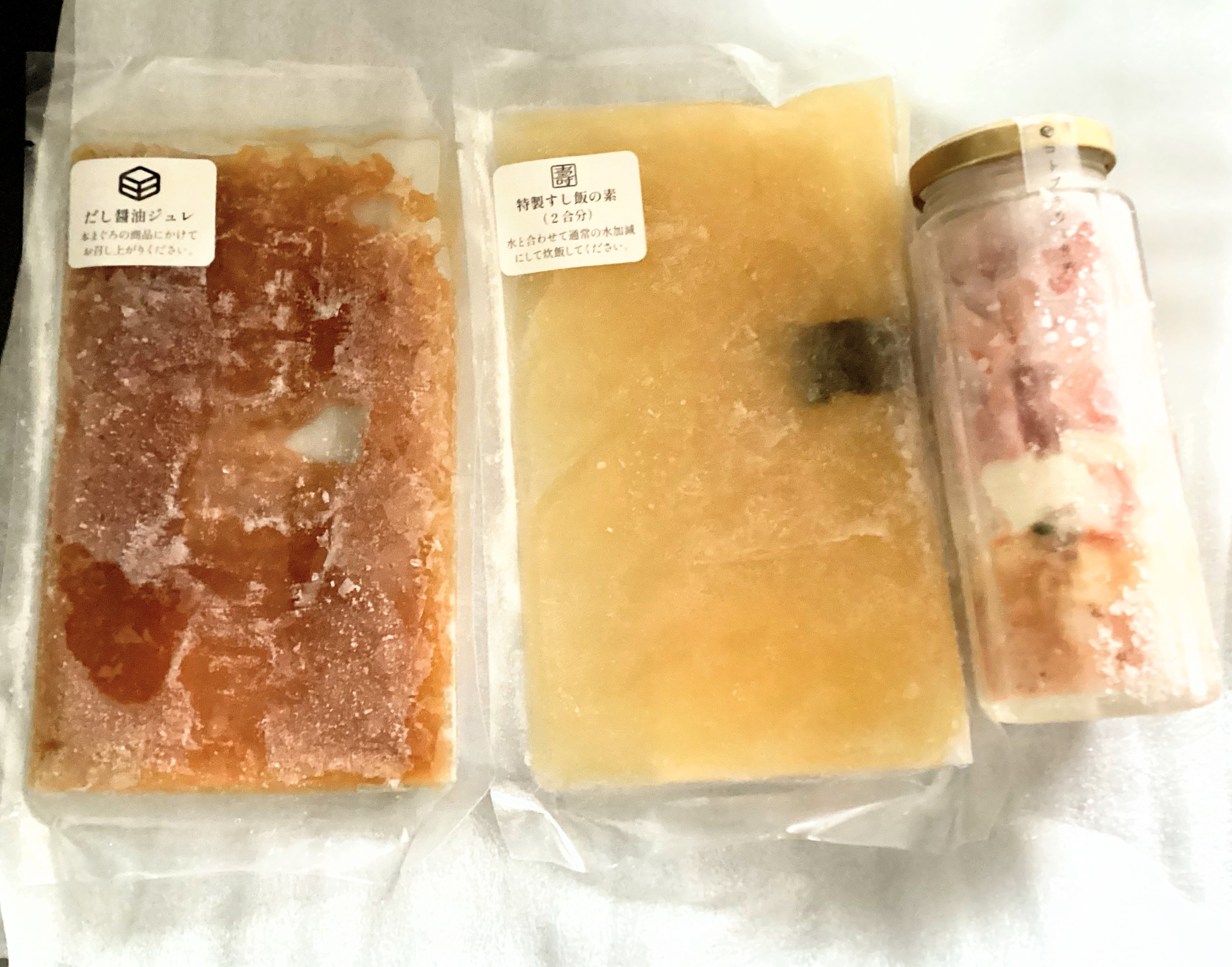 食べてみると、冷凍されていたとは思えないほど新鮮でした。厚めに切られたプラチナまぐろは、ねっとりとした食感でとても濃厚です。赤えびはぷりぷりで、いくらはぷちぷちで…いろいろな海鮮の味や食感が楽しいです。瓶に入ってるのを見た時、量が少ないかな?と感じましたが、食べてみると満足できました。ジュレは優しい味で海鮮の旨味を引き出してくれます。