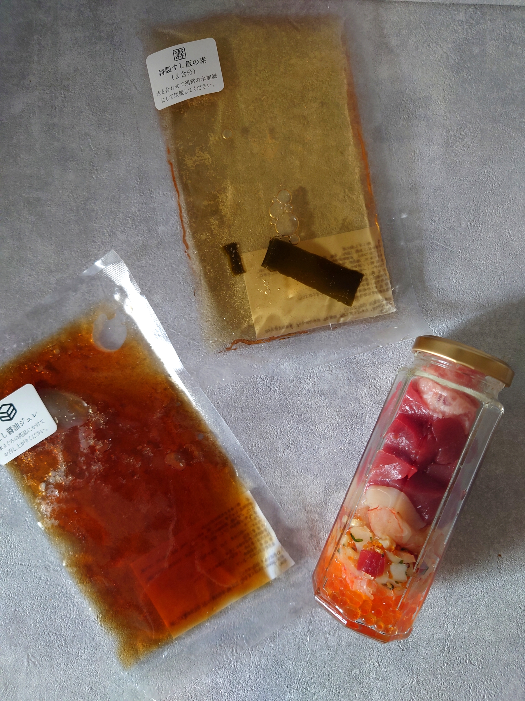 海鮮丼の具は、美味しそうな海鮮が層になって瓶に詰められています。本当に美しいです。すし飯にかけると、プラチナまぐろ、いくら、ずわい蟹、ほたて、赤えび、ねぎとろ、つぶ貝など様々な種類が入っていることが分かりました。ジュレをかけるときらきらして宝石箱のようです。