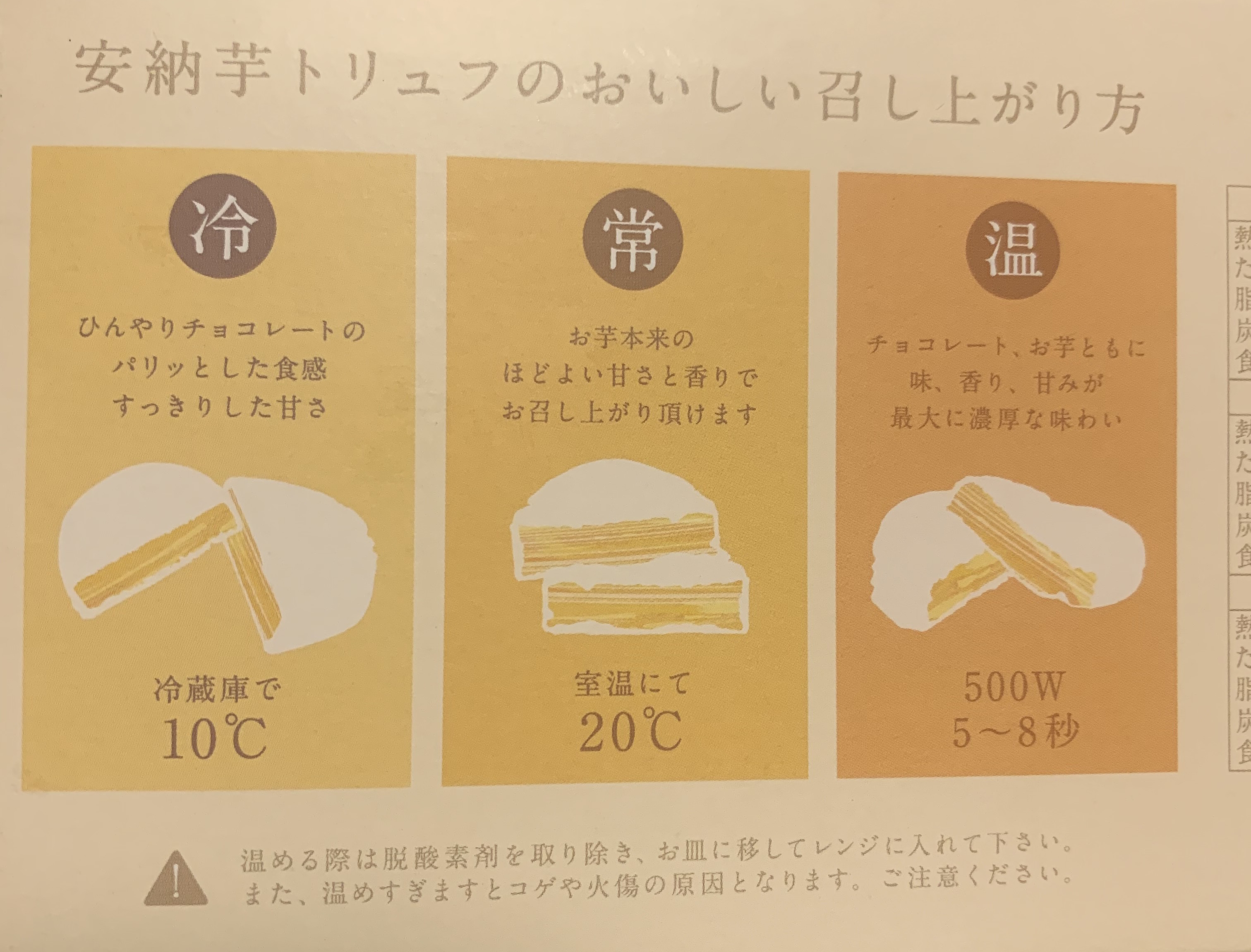 常温では安納芋の風味と甘みがより豊かに感じられ、温めるとチョコと芋がとろけ合い、まろやかで優しい味わいに。