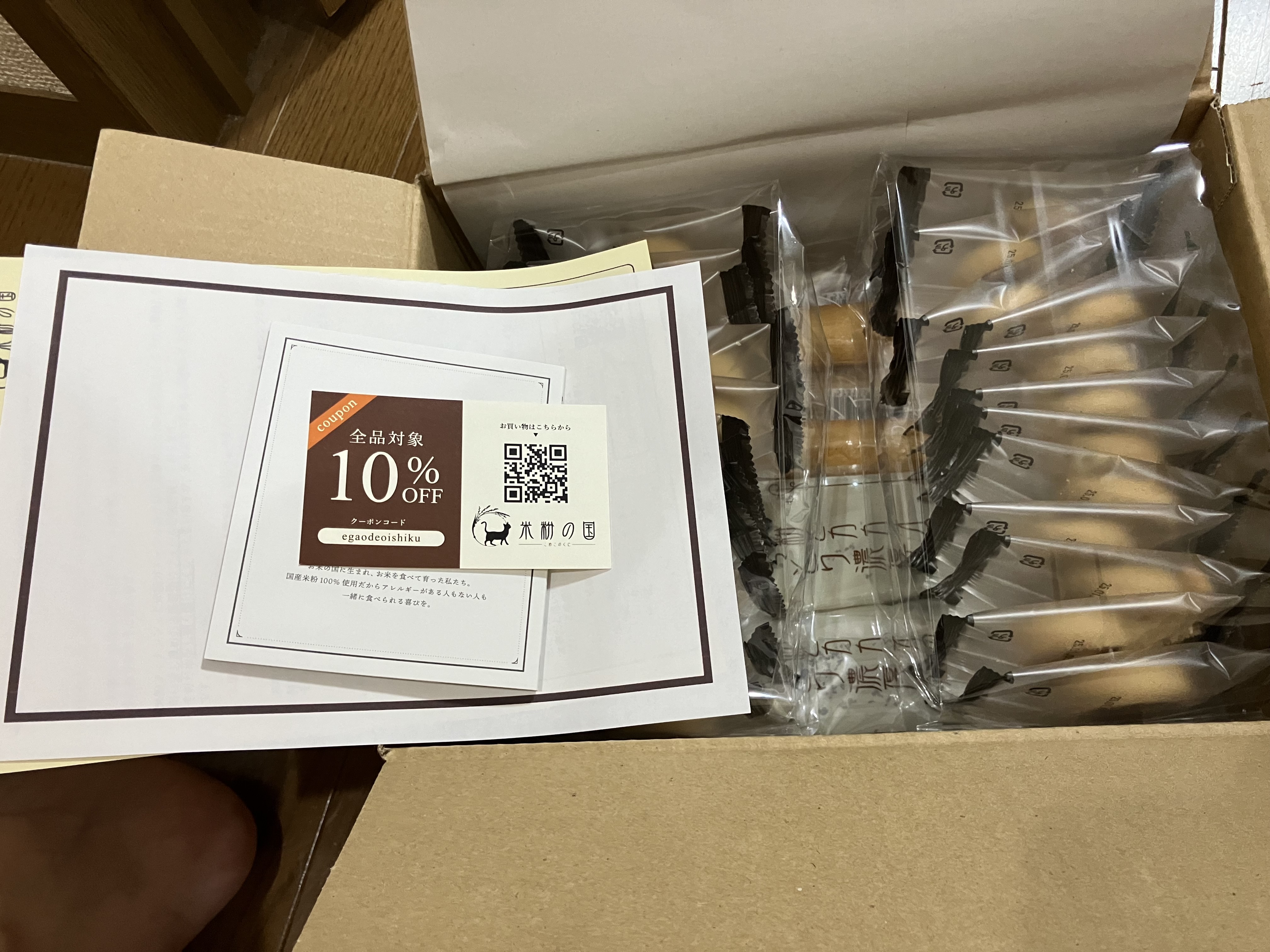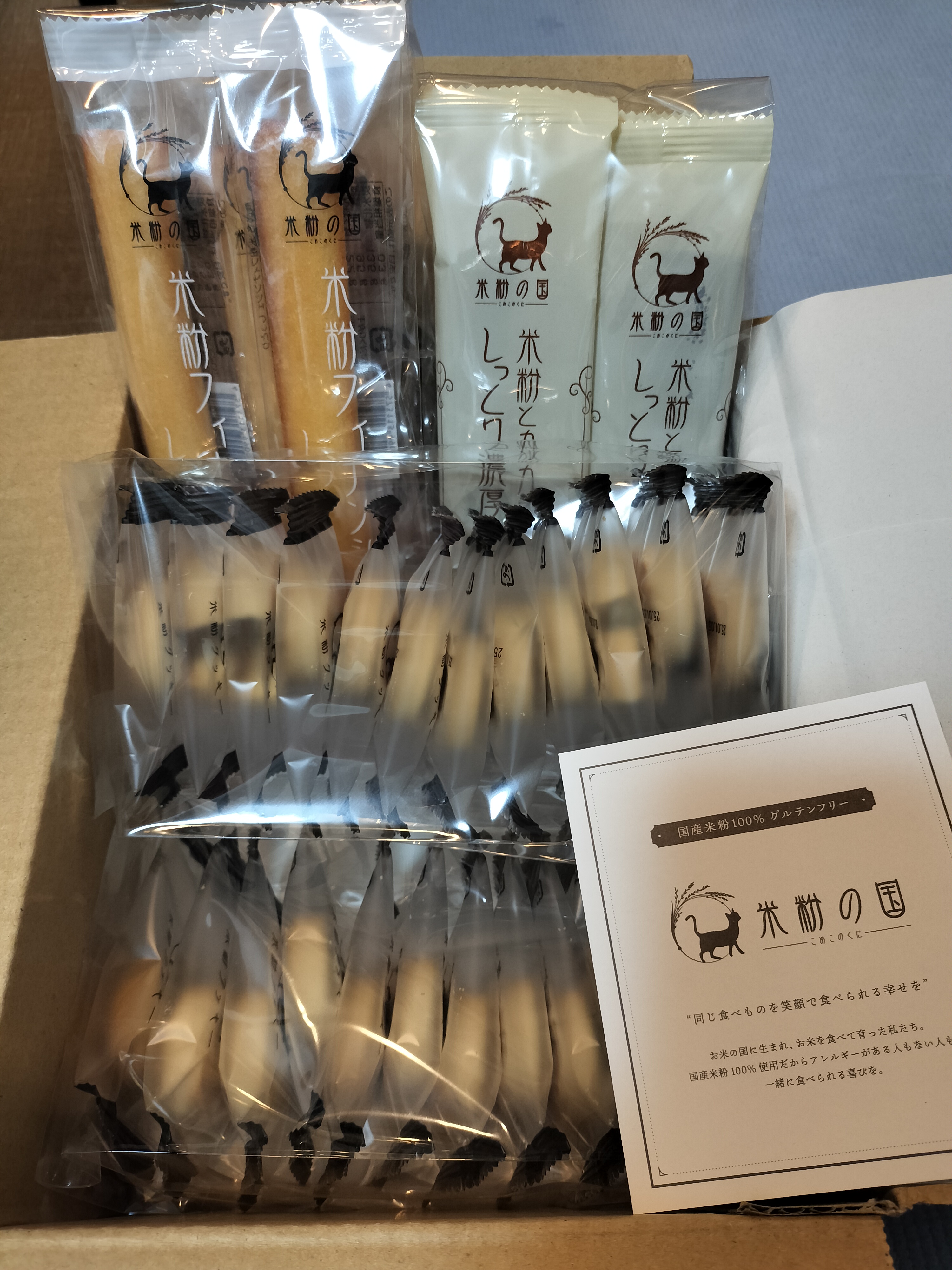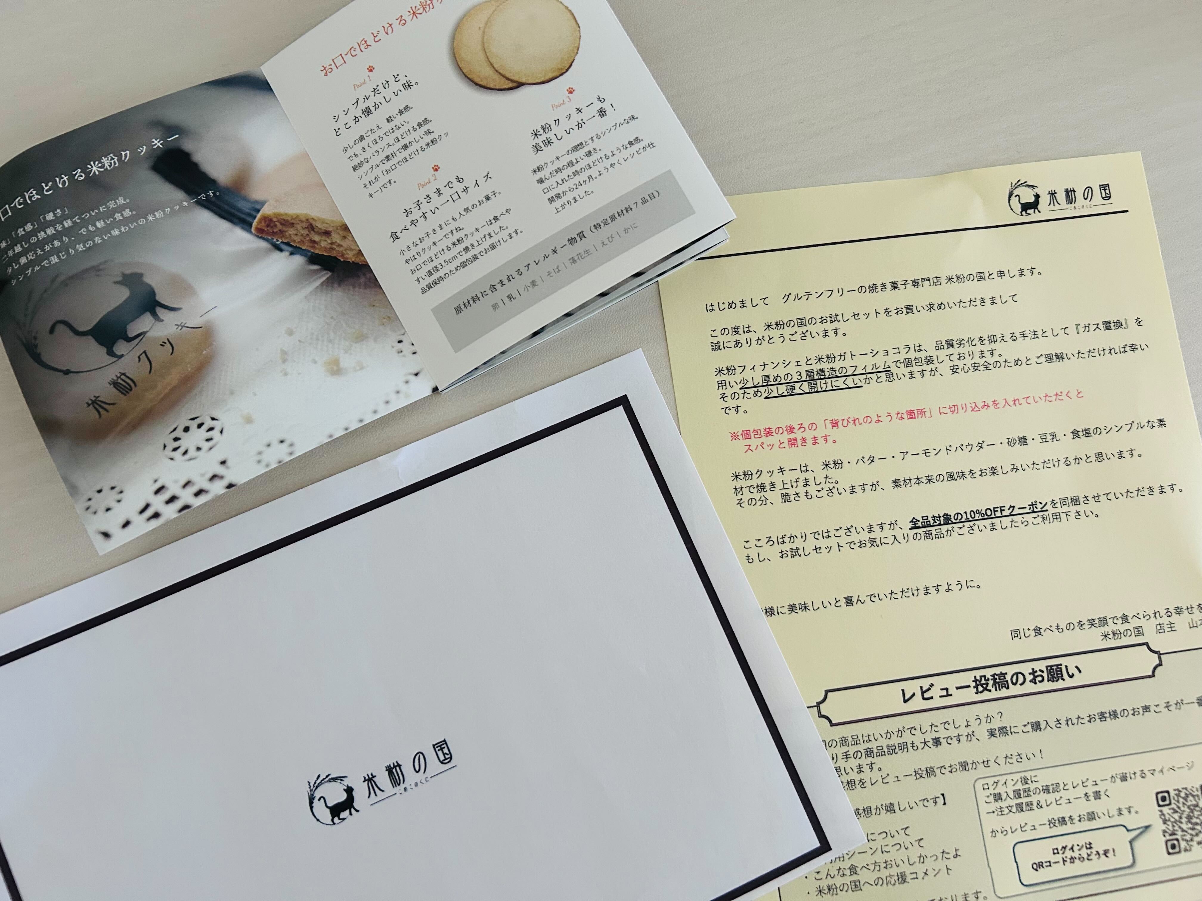 商品自体だけでなく、包装も丁寧な印象を受けました。届いた外箱がそのまま商品梱包になっており、過剰包装でない点もエコで素敵だと思います。また、説明書やパッケージのシンプルな見た目が米粉スイーツの純粋さを感じました。