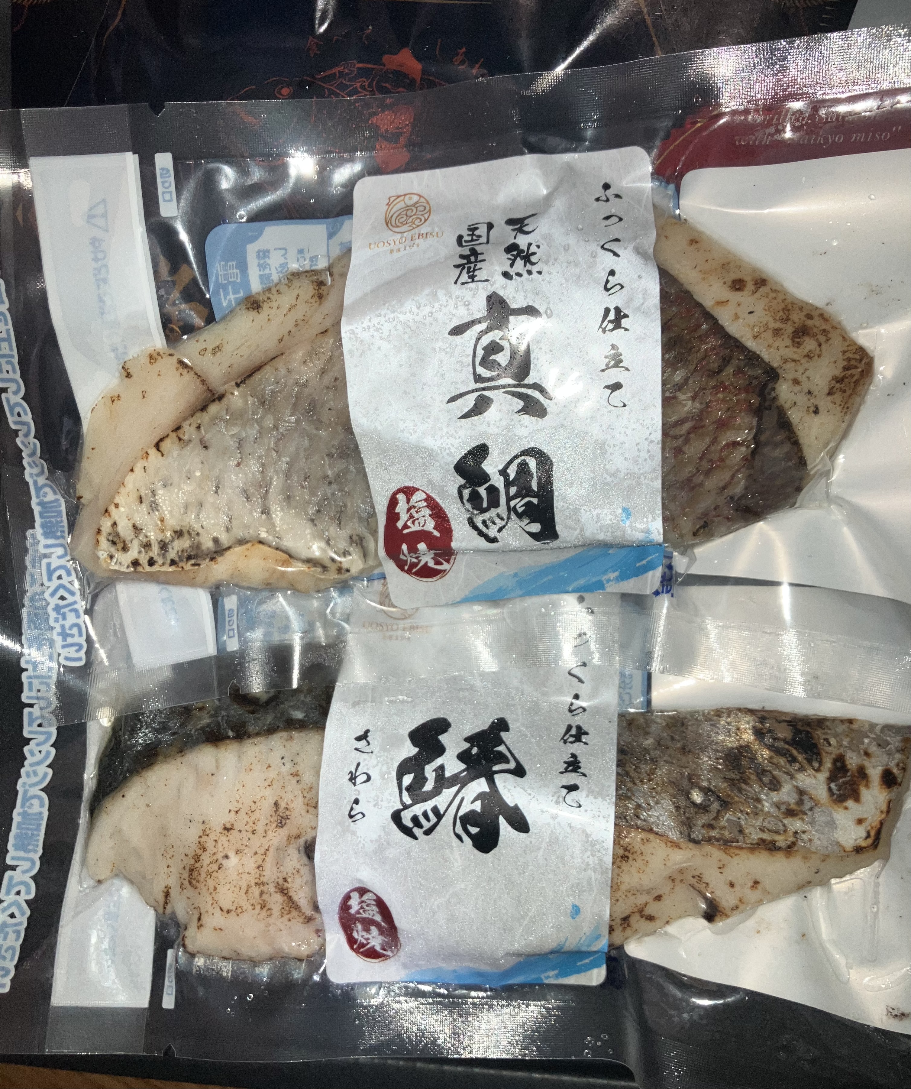 【鰆(さわら)の塩焼き】鯛同様程よい塩味。ふっくらした身。厚みもちょうどいい。香りもよかったです。電子レンジタイプは、冷凍から電子レンジで1分30秒~2分ほど。本当にそんな短時間で仕上がるのか、半信半疑。冷凍から直行は、1分30秒ではやはり。30秒弱延長で、いい香りがしてきました。食べるつもりで少し前に冷蔵庫に入れておけば、1分30秒でも行けます。これは、私だけかもですが。調理方法は読んだんですけど、、、(時間と調理法はちゃんと見た)本来、皮目、パッケージで言うと表に当たる商品名が表示されている方が、下でチンです。お魚の向きの習性ですかね。。。裏向きで温めてしまいました。鯛がちょっと反った感じに仕上がってしまったのは、関係あるのか。。。