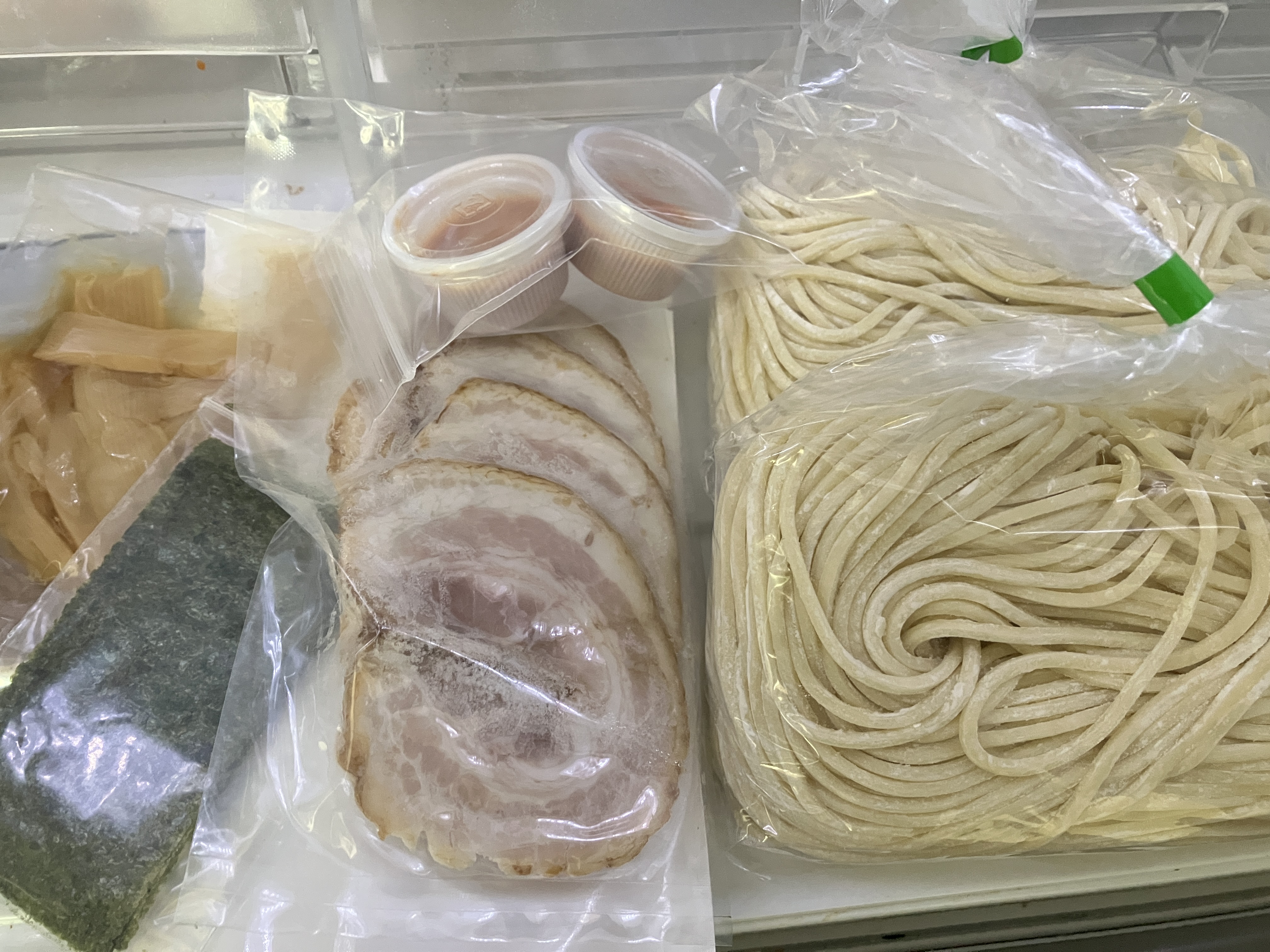 麺、スープ、チャーシュー、メンマ、海苔、辛味肉などがセットになっています。