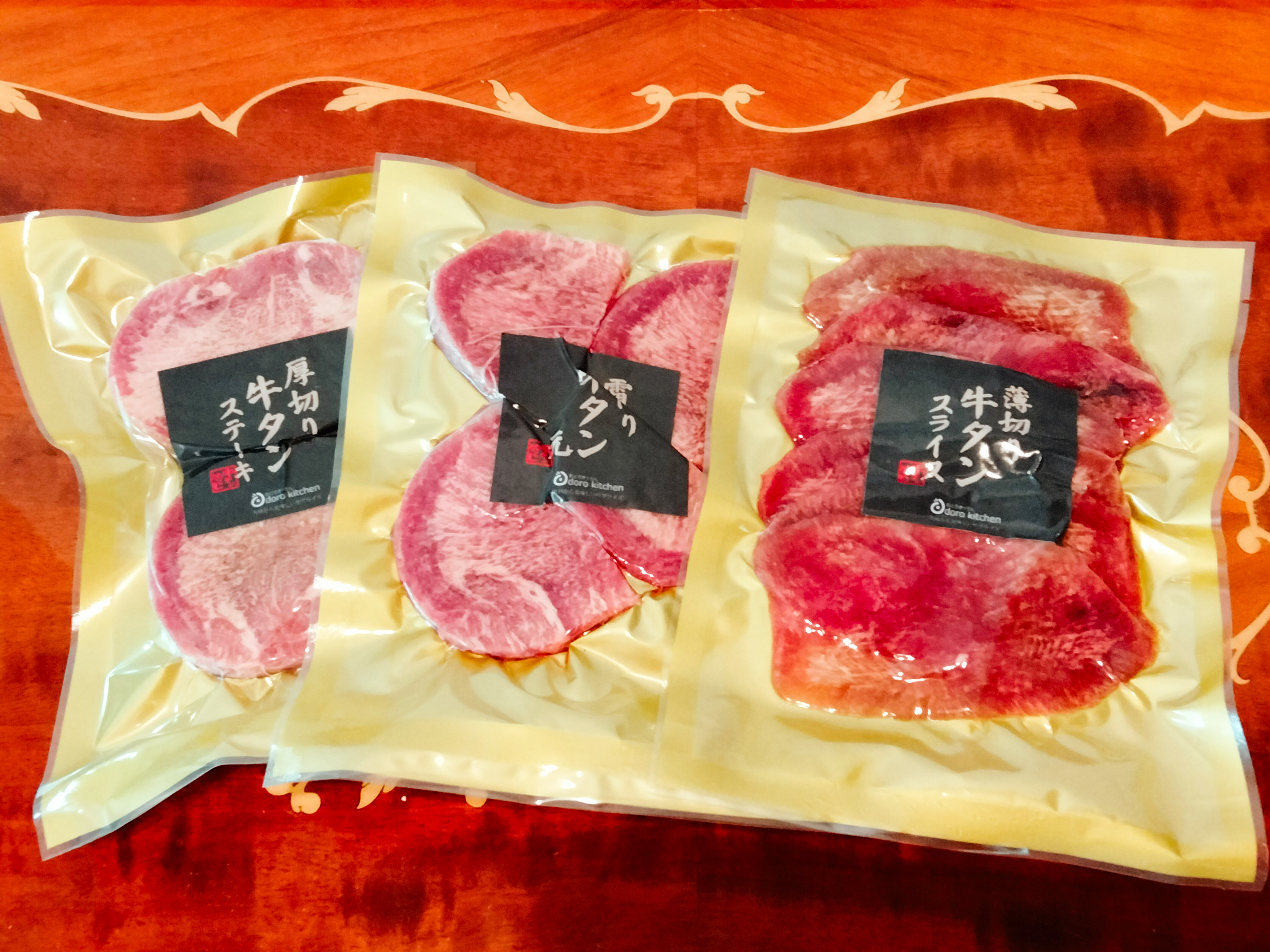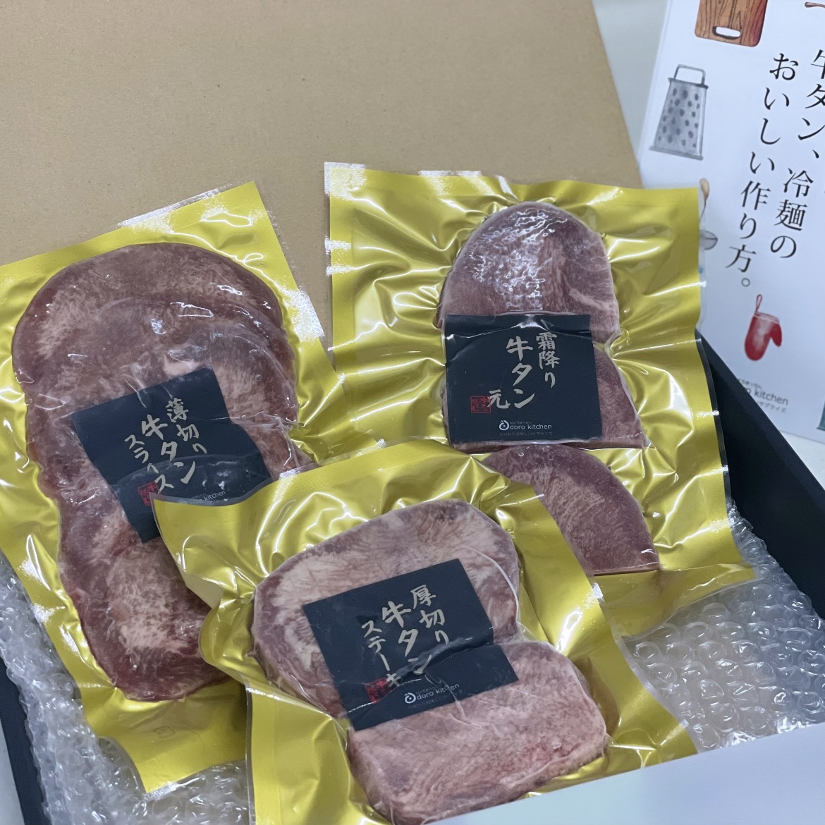 黒い化粧箱に入った牛タン3種。それはそれは綺麗に包まれた牛タン、、これは大切な人へのギフトにもピッタリ。わが家もこういうギフトを頂いたらめちゃくちゃ嬉しい!