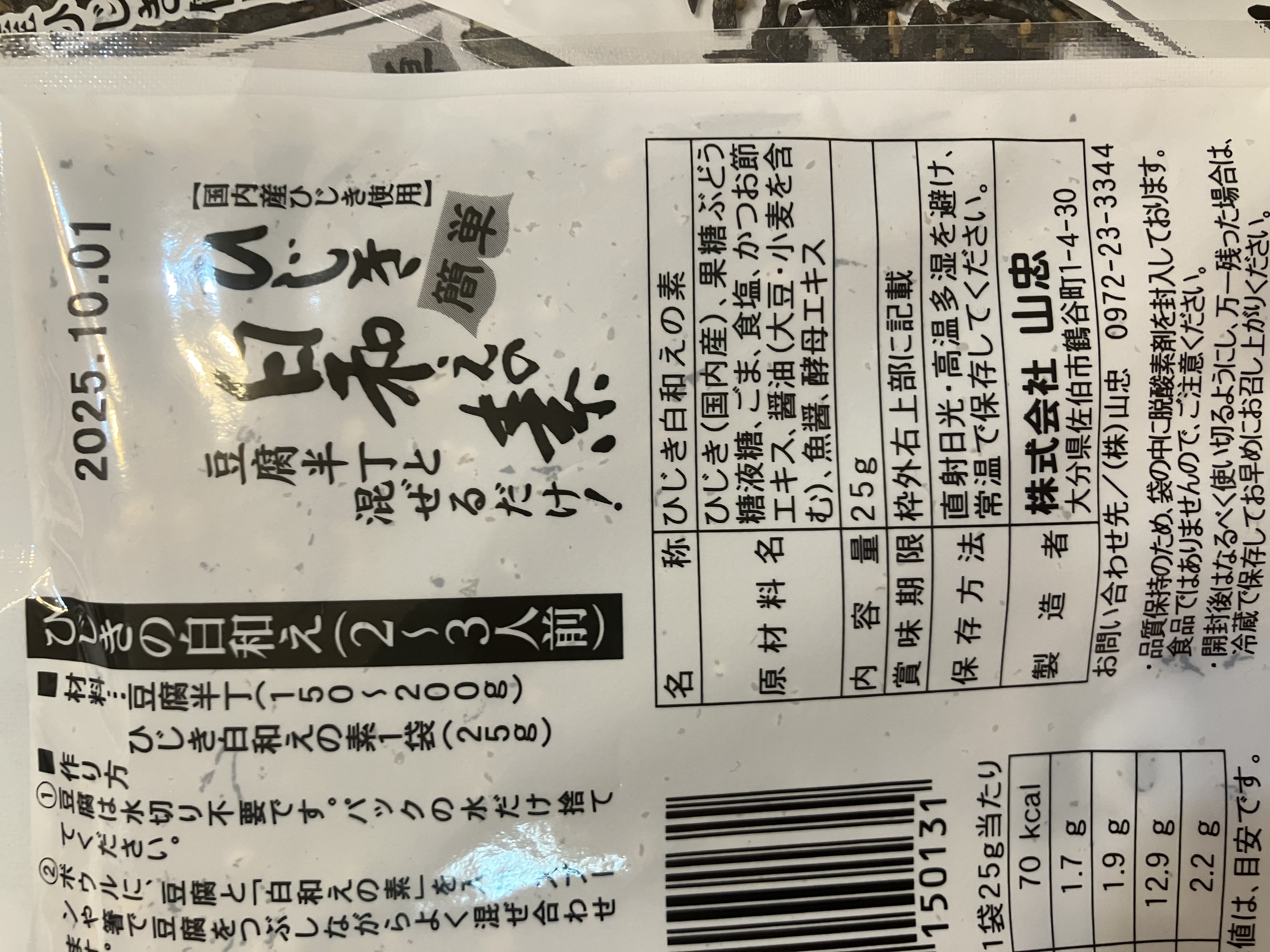 まず封を開けると、ひじき煮のような、ひじきのとても良い香りがします。豆腐に混ぜるとひじきが豆腐の水分を吸って、柔らかく程良い歯ごたえのひじきになり、ひじきそのものの味がまず美味しいです。出来上がった白和えの味は濃すぎず、塩味と甘みのバランスも抜群!