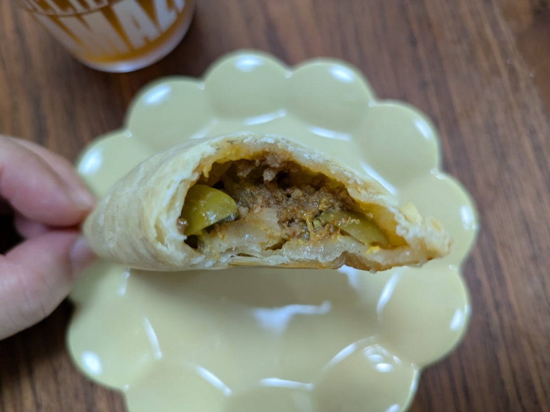 早速食べてみると、もちもちの皮とずっしりと具沢山な中の具材が絶妙にマッチ!揚げ餃子にも近いけどブリトーにも何となく近いような気もしました!