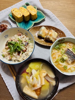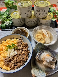 混ぜご飯、そぼろごはん、チーズ焼き、大根おろしのせ、冷汁風。